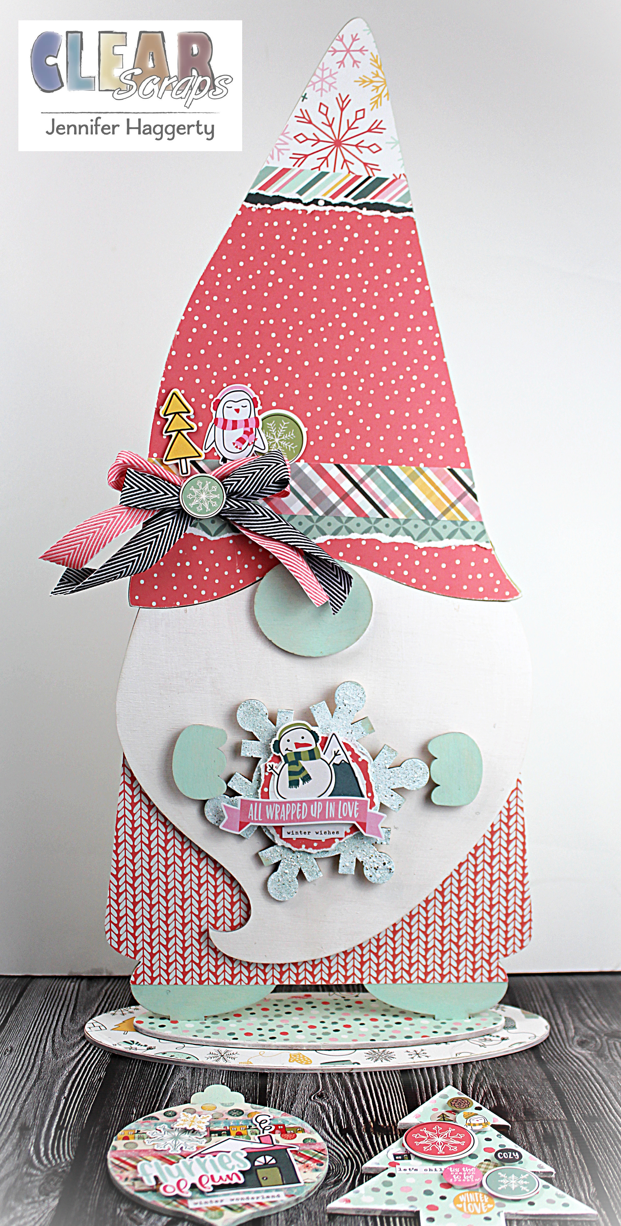 The XL Wood Gnome 2 is perfect for dressing up for just about any theme or holiday! I used a bright winter theme for my Gnome to decorate the area next to our fireplace!
