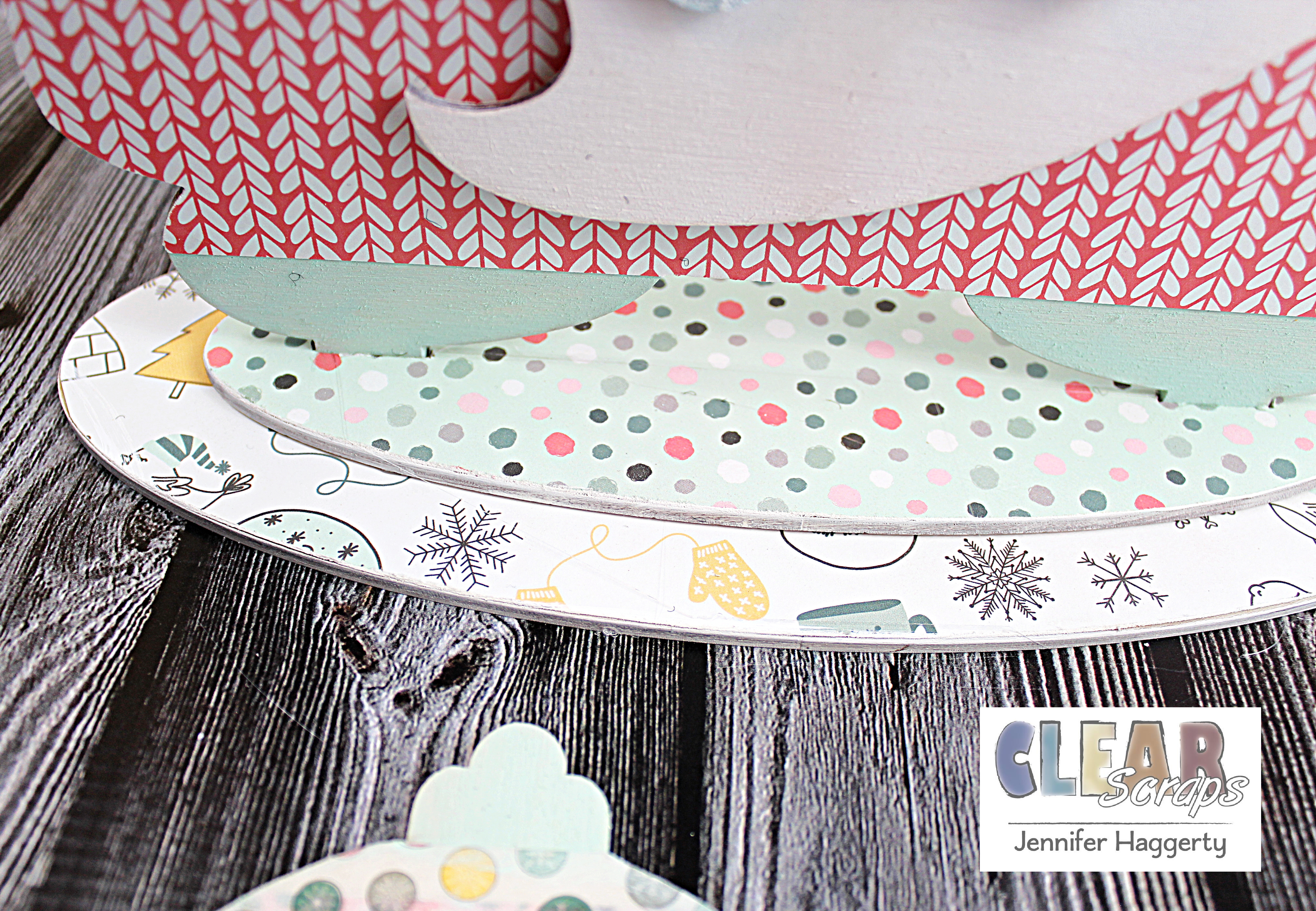 I covered the Tree using patterned paper and my Beacon Adhesive. I then added a light coat of white acrylic paint the edges followed by using circular embellishments.