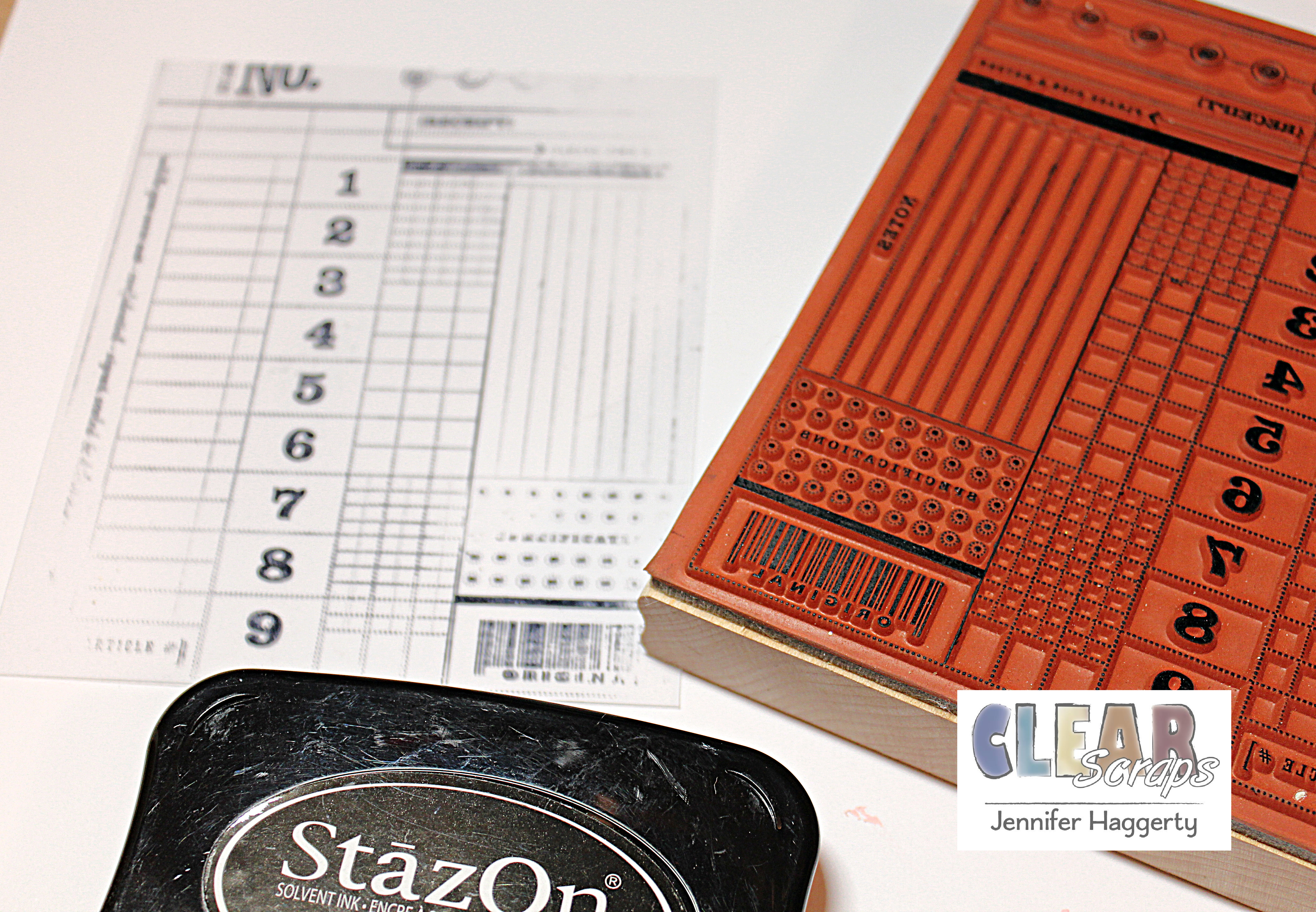 For the front of my card I decided to use a portion of the 12×12 Acrylic Sheet. Here, I cut a 4.5 x 5.5 inch piece in which I used an oversized stamp with black StazOn. It's helpful to only peel the protective frame from the side you are working.