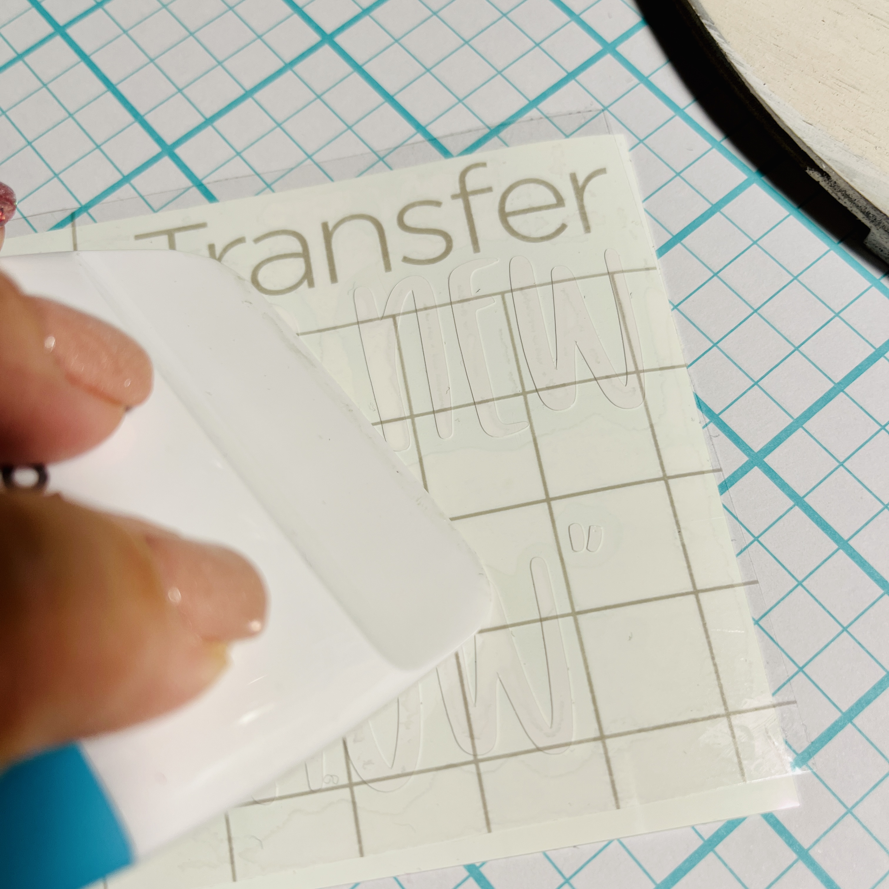 Next, I rub transfer tape on to the letters with a squeegee. I make sure to rub both the front and back sides well so the letters will transfer.