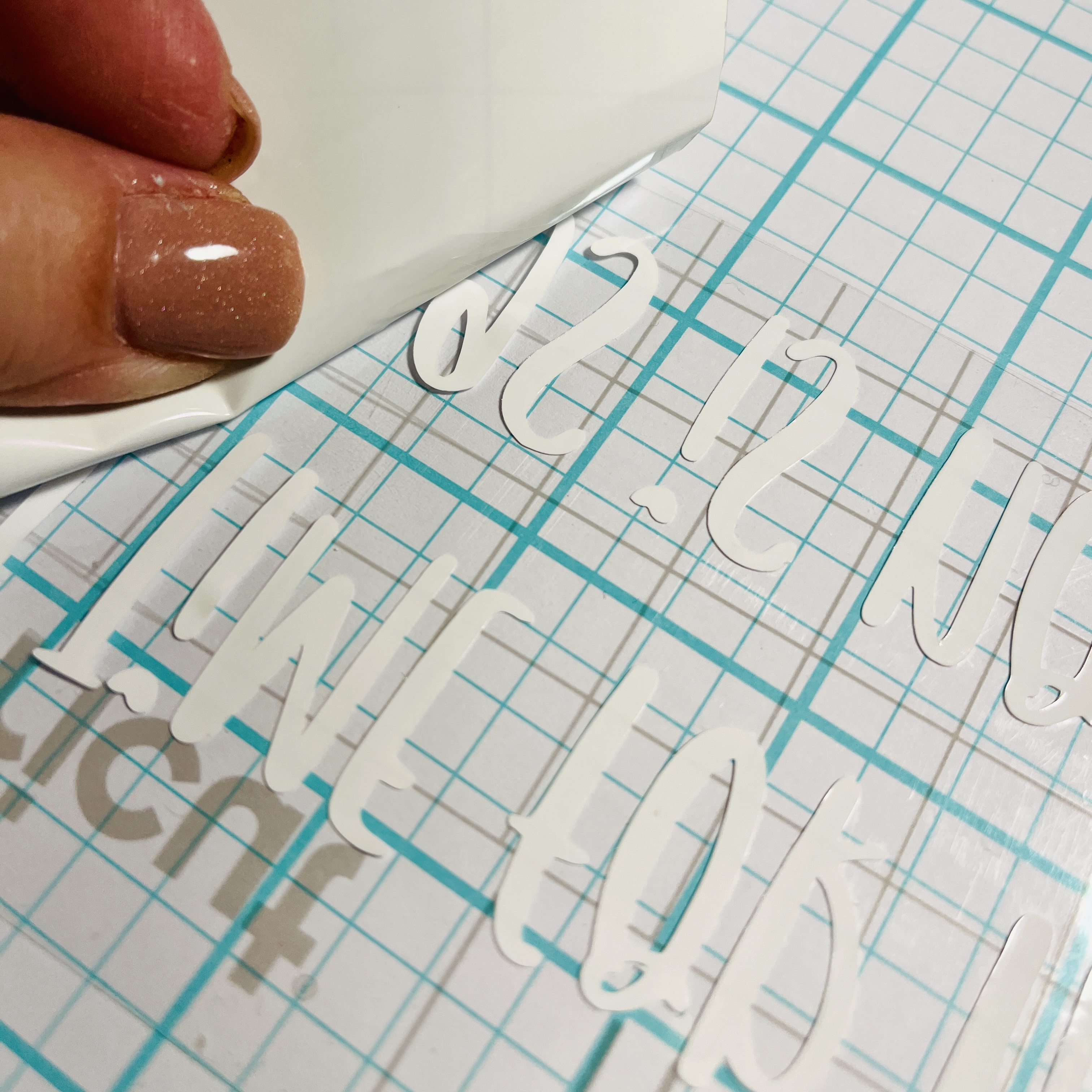 From here I take the plastic back side off the letters, pulling slowly as I do. If any letters stick, I use a weeding tool to place them gently back on to the transfer tape.