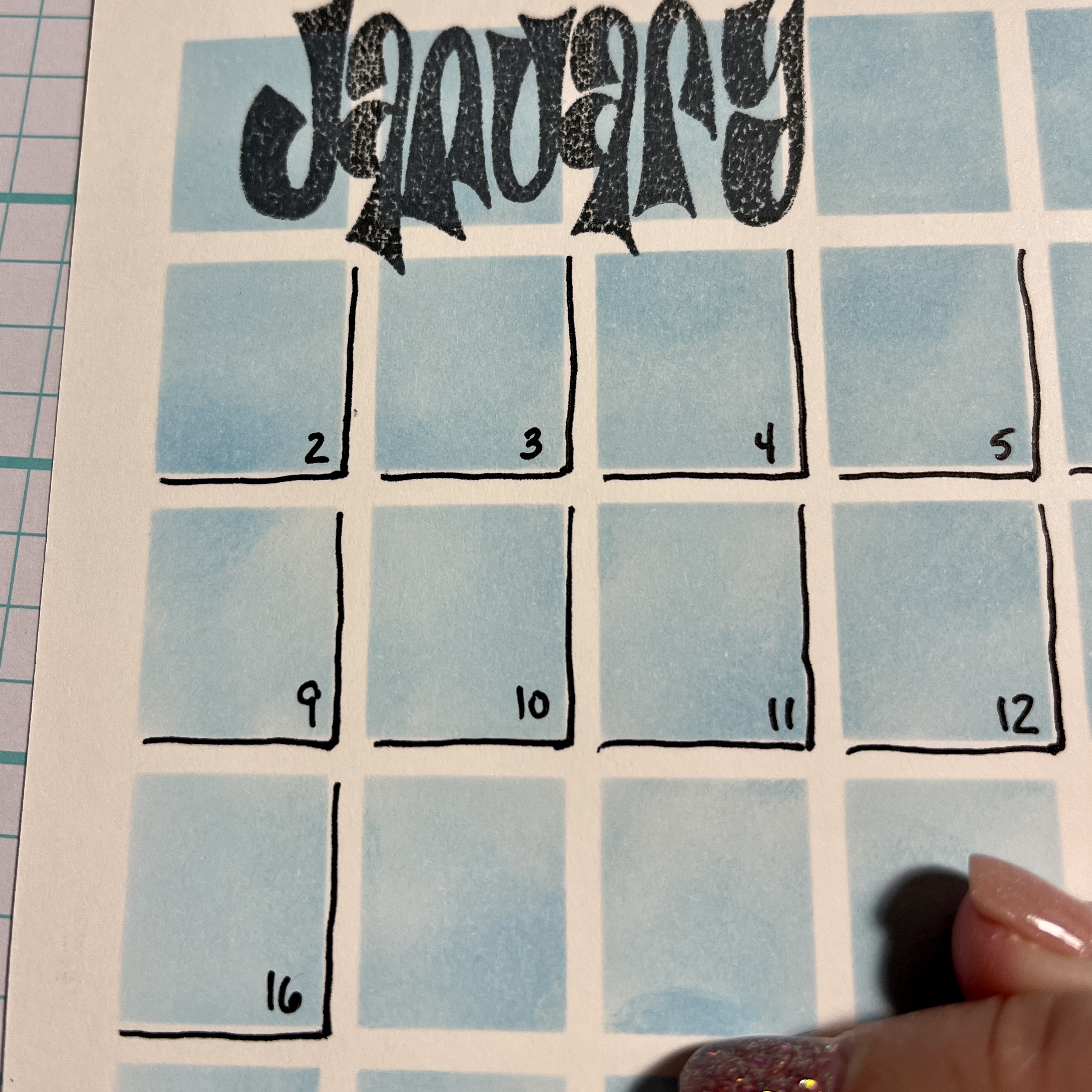 Then, when my pages were dry, I went over the right corners of the boxes with a black gel pen, adding dimension to the page. I also wrote in some numbers in the lower right. Stamps for the month name and other images complete the look!