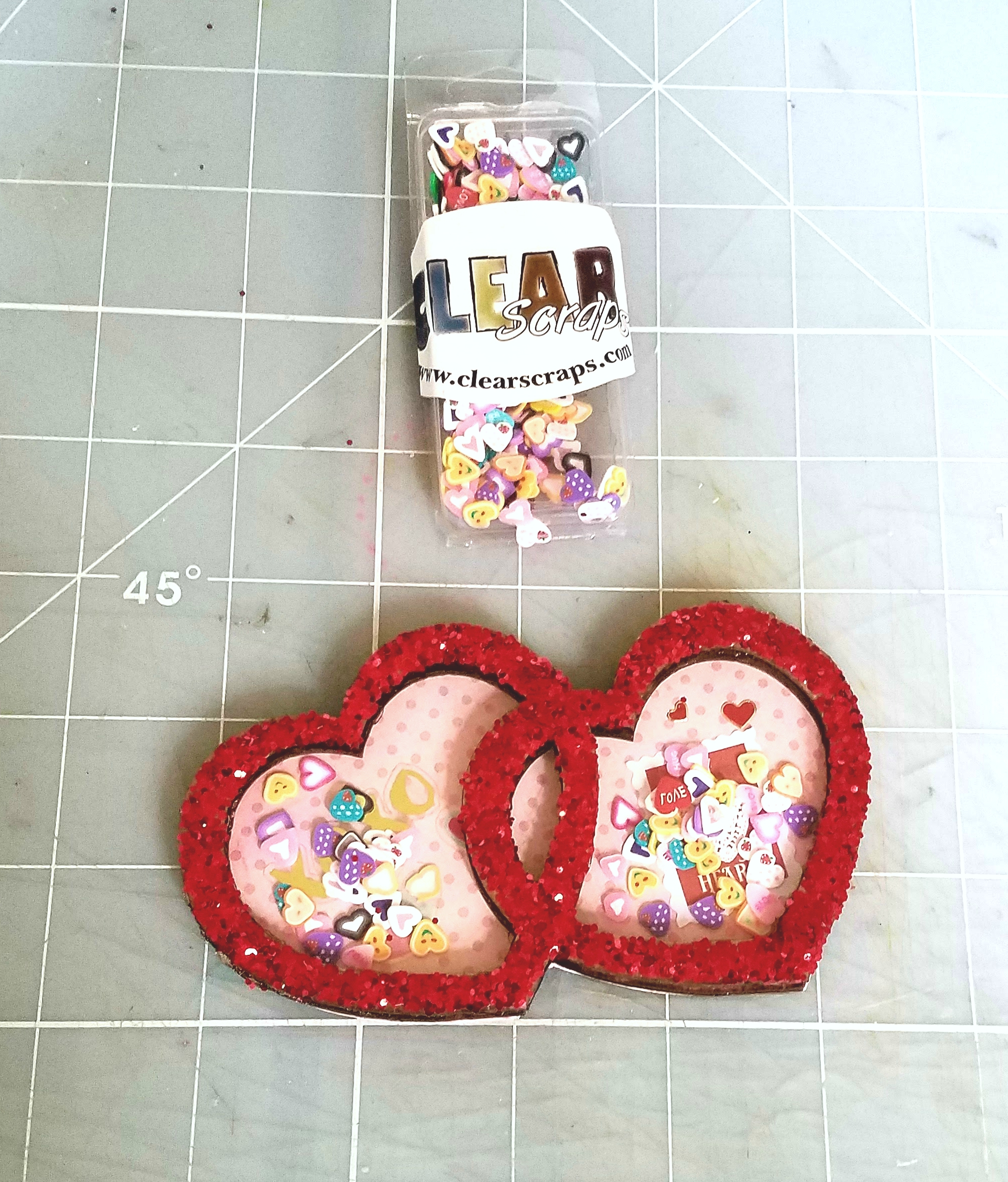 Now take your Beacon 3 in 1 glue and adhere your next two chipboard shaker pieces in place. Add your shaker filler, I used Clear Scraps Sprinkles Heart Love filler inside each heart. Click Here Take your acrylic layer and peel off the protective film on both sides from both sides before gluing down onto your shaker. Then add your glitter shaker piece on top! Set aside and let dry throughly before shaking!