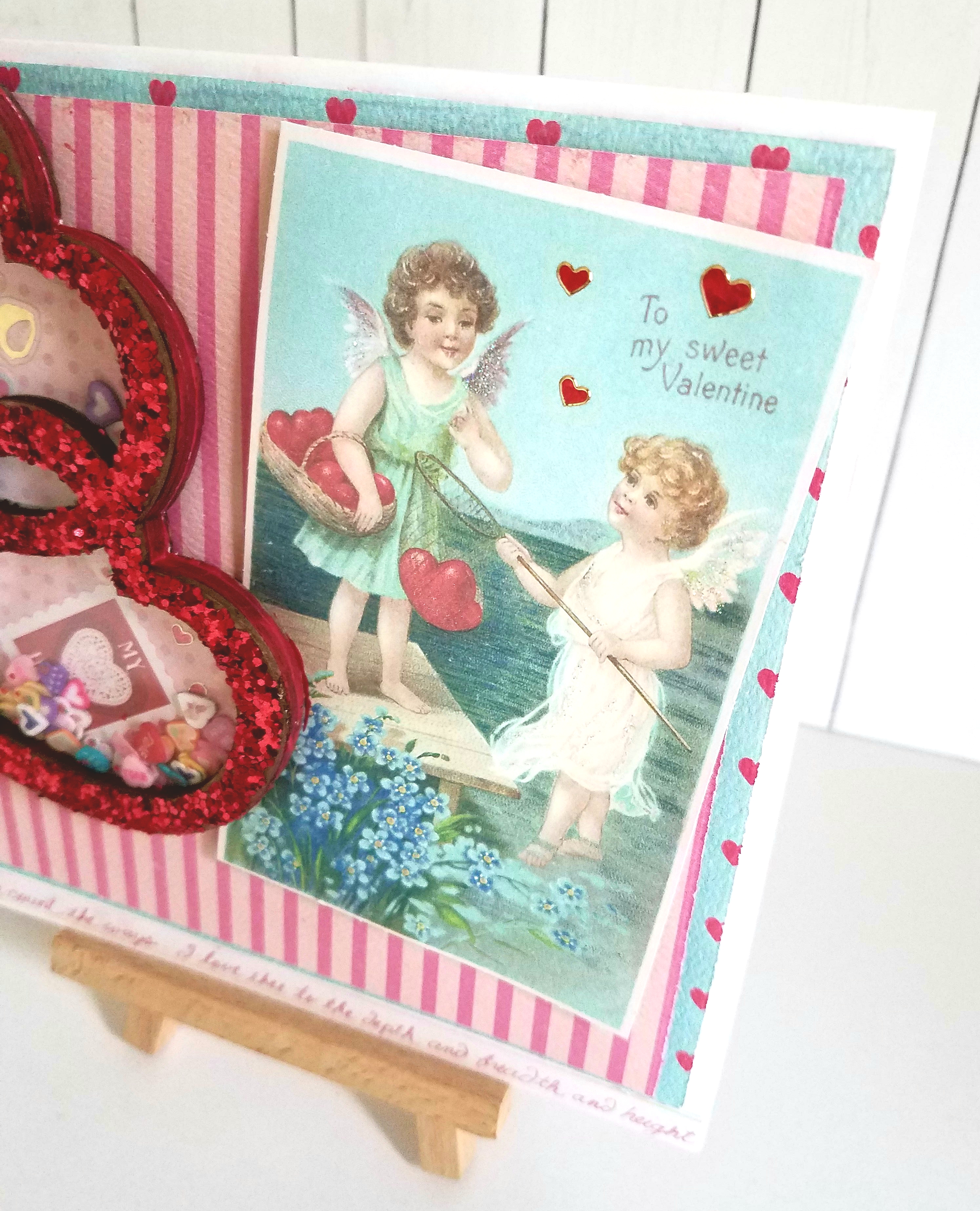 To finish off my card, I cut out one of the journaling cards, added some foam dots on the back, then adhered to my card slightly slanted towards the upper right corner. I added a few little Dazzle heart stickers above the sentiment. And I took some Stickles glitter "Star Dust" and applied to the angels wings and dress. With my sparkle pen, I added alittle shimmer to the basket of hearts! Now glue your Double hearts shaker in the upper left corner of your card.