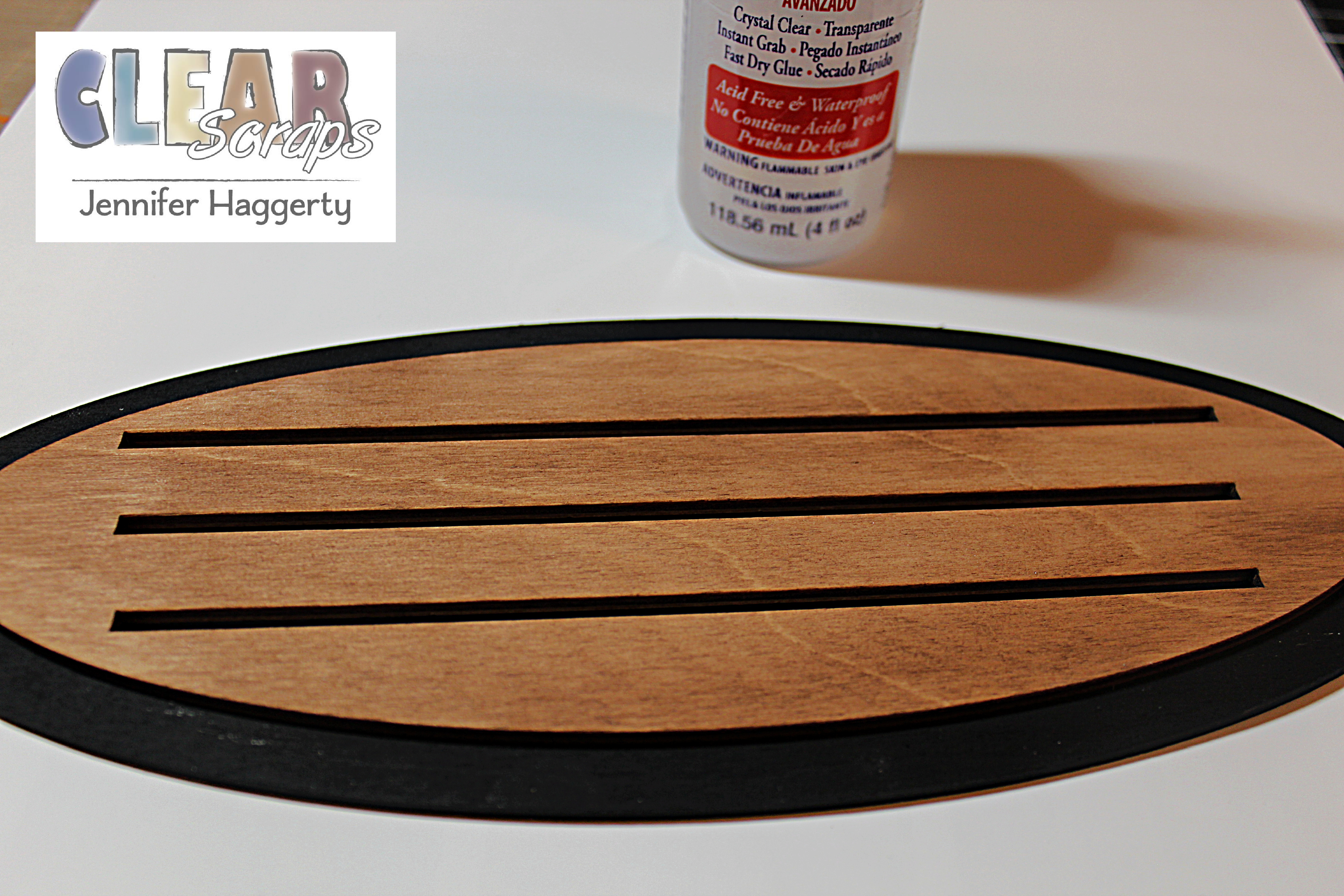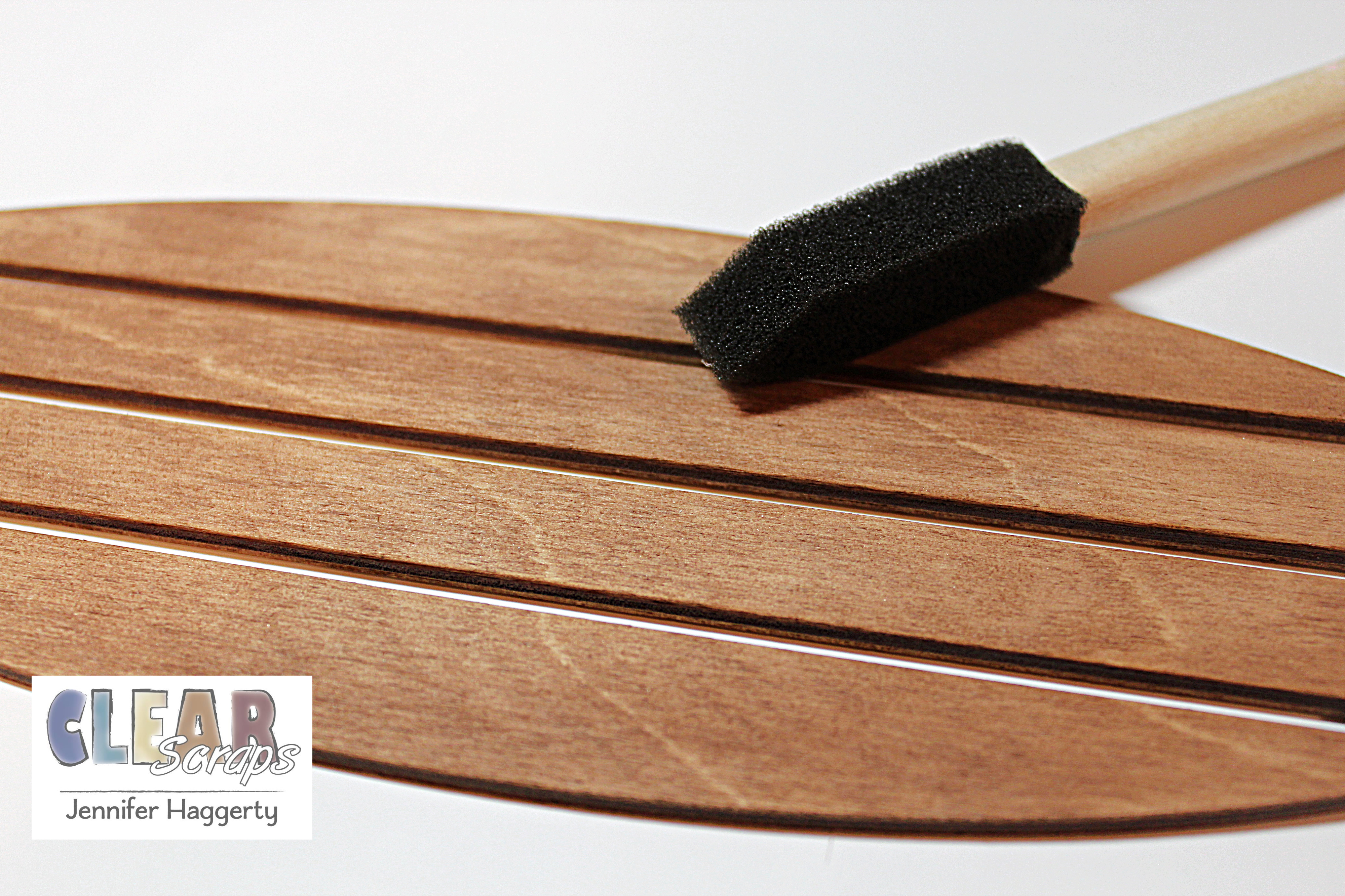 On the smaller oval base, I took brown acrylic paint and water and applied it to the surface of the wood. I wanted a more muted look to match the collection I used.