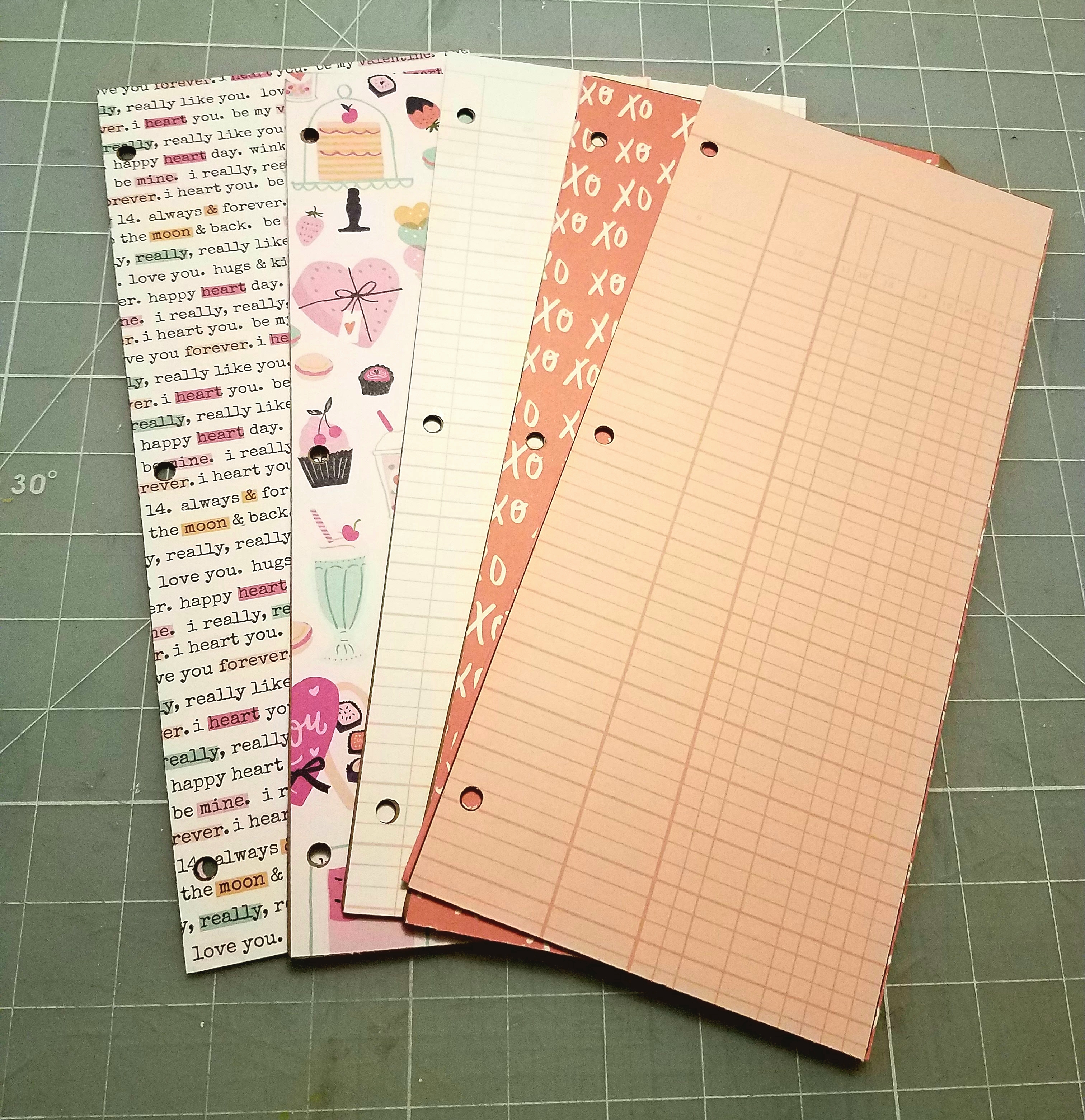 Page 6: I cut another pocket from one of the papers in the 6×8 paper pad. I trimmed it down to measure 5×7 inches. I glued a heart trim at the top of my pocket. Tucked a few journal cards and tag inside the pocket.
