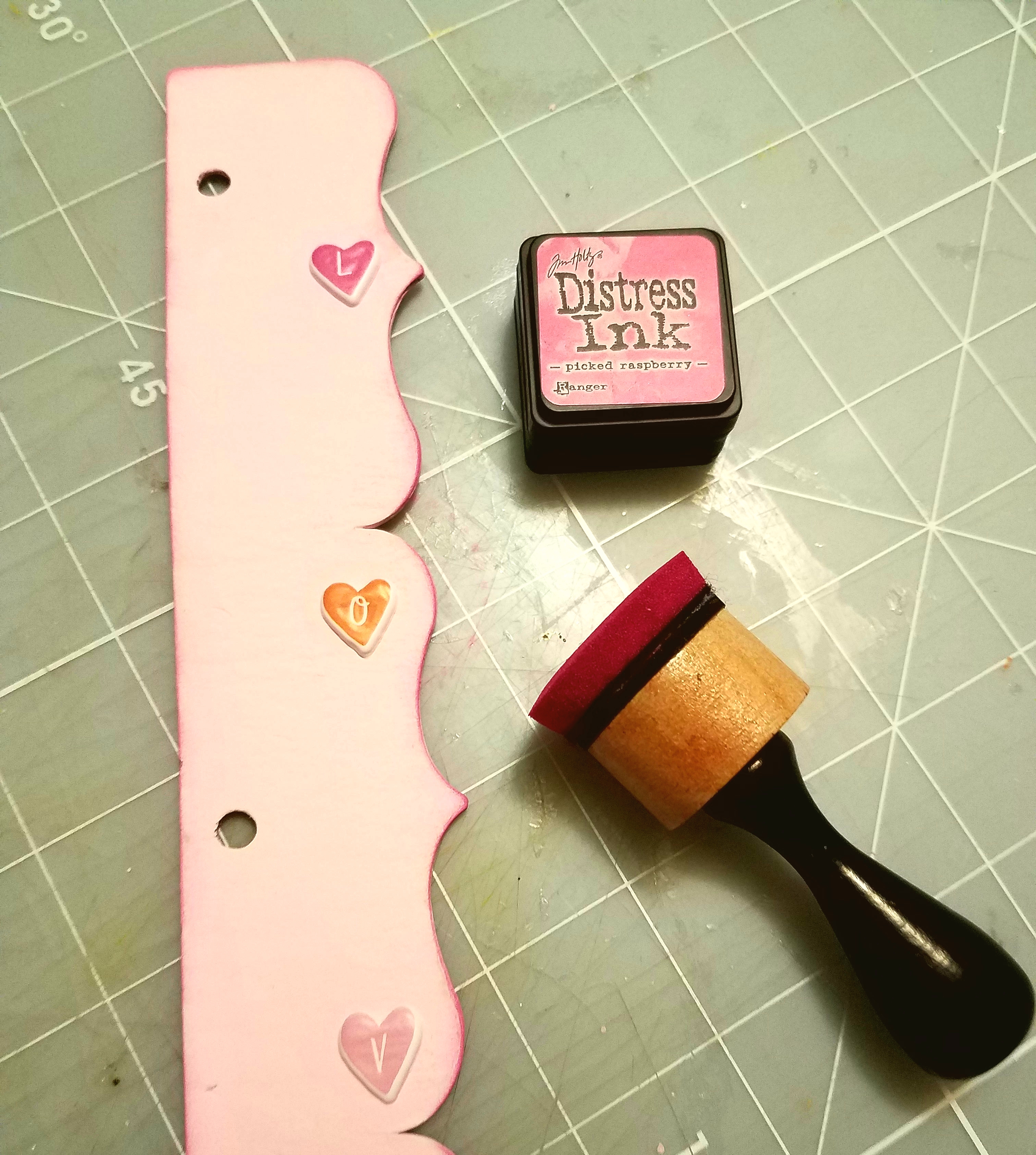 Next I painted both Deco border pieces with some light pink acrylic paint. After they dry, I applied some Distress Ink along the edges with my ink dabber. Then I adhered some L-O-V-E puffy stickers along the edge.