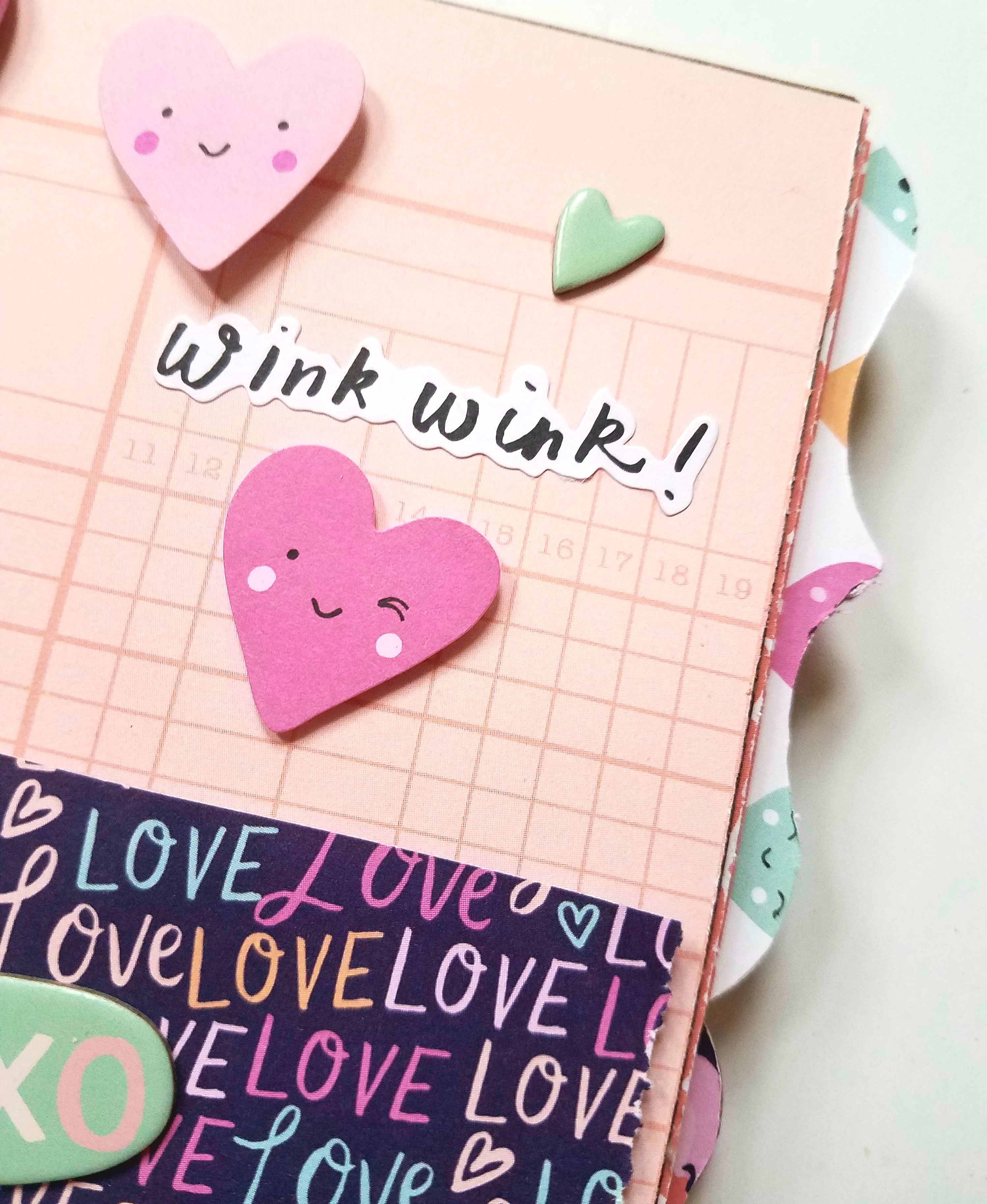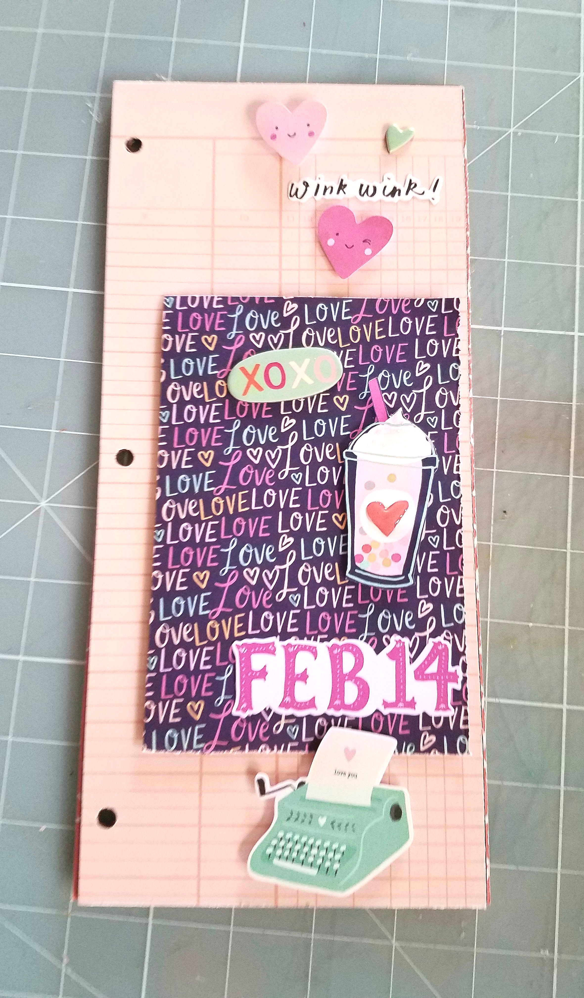 For page 1: I took one of the journaling cards and scored 1/2" inch at the top and adhered as a flip up page. You could add photos on both top and bottom. I added a sentiment sticker at the top and a few chipboard sticker hearts at the bottom.
