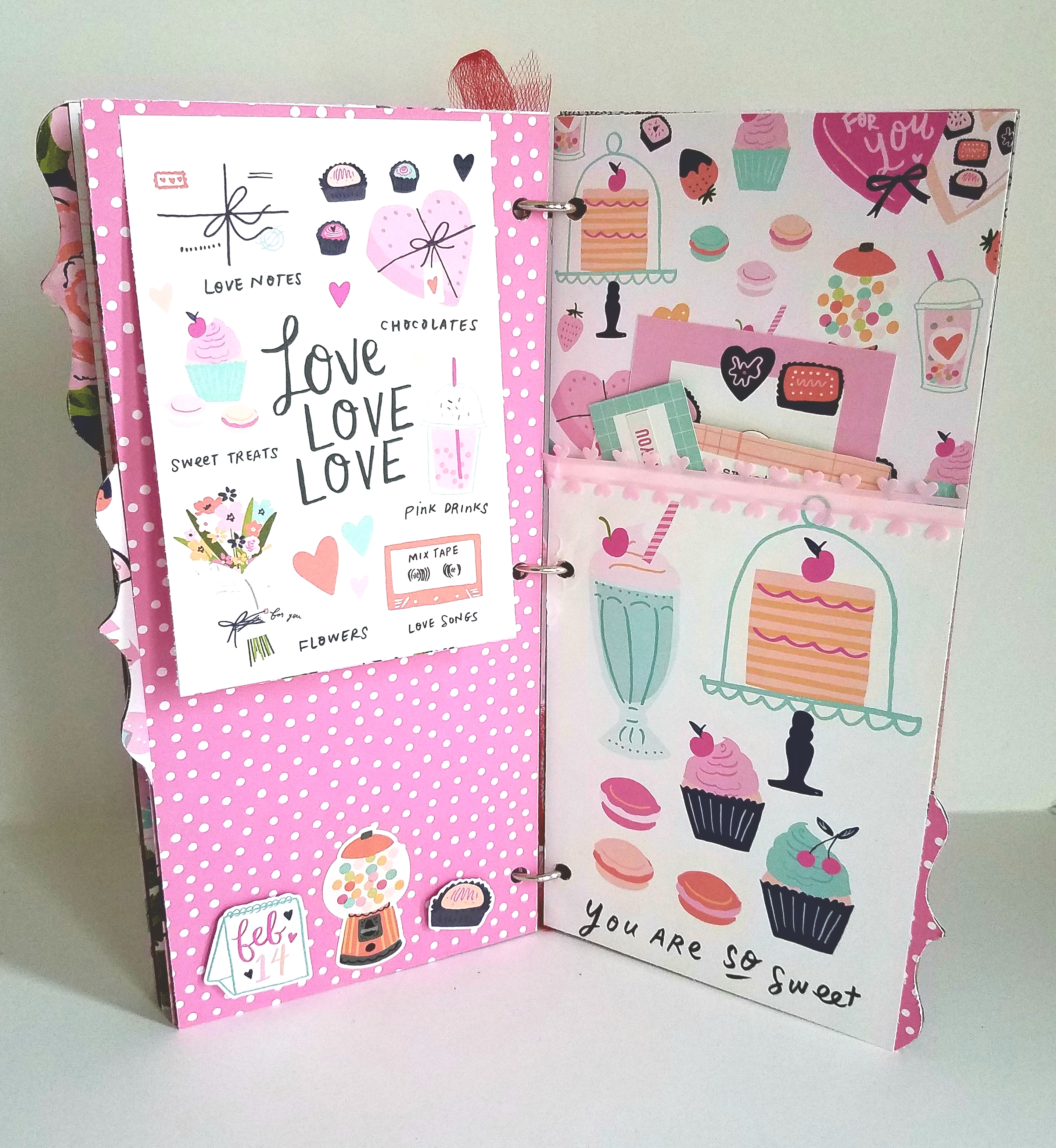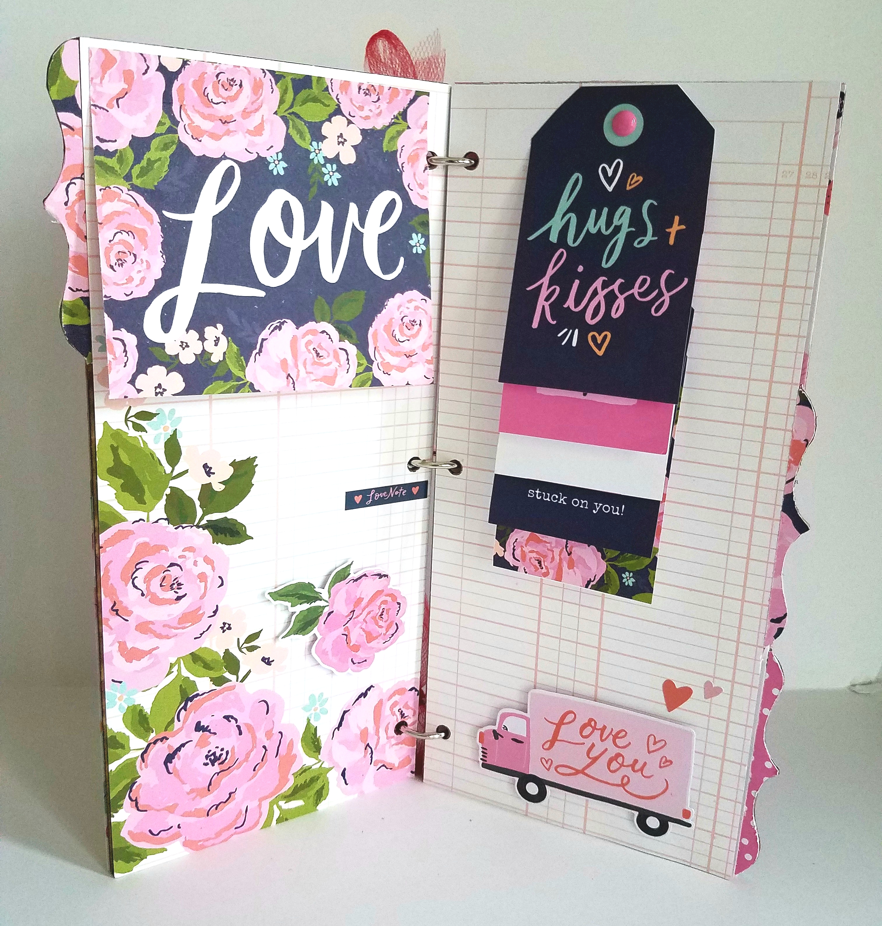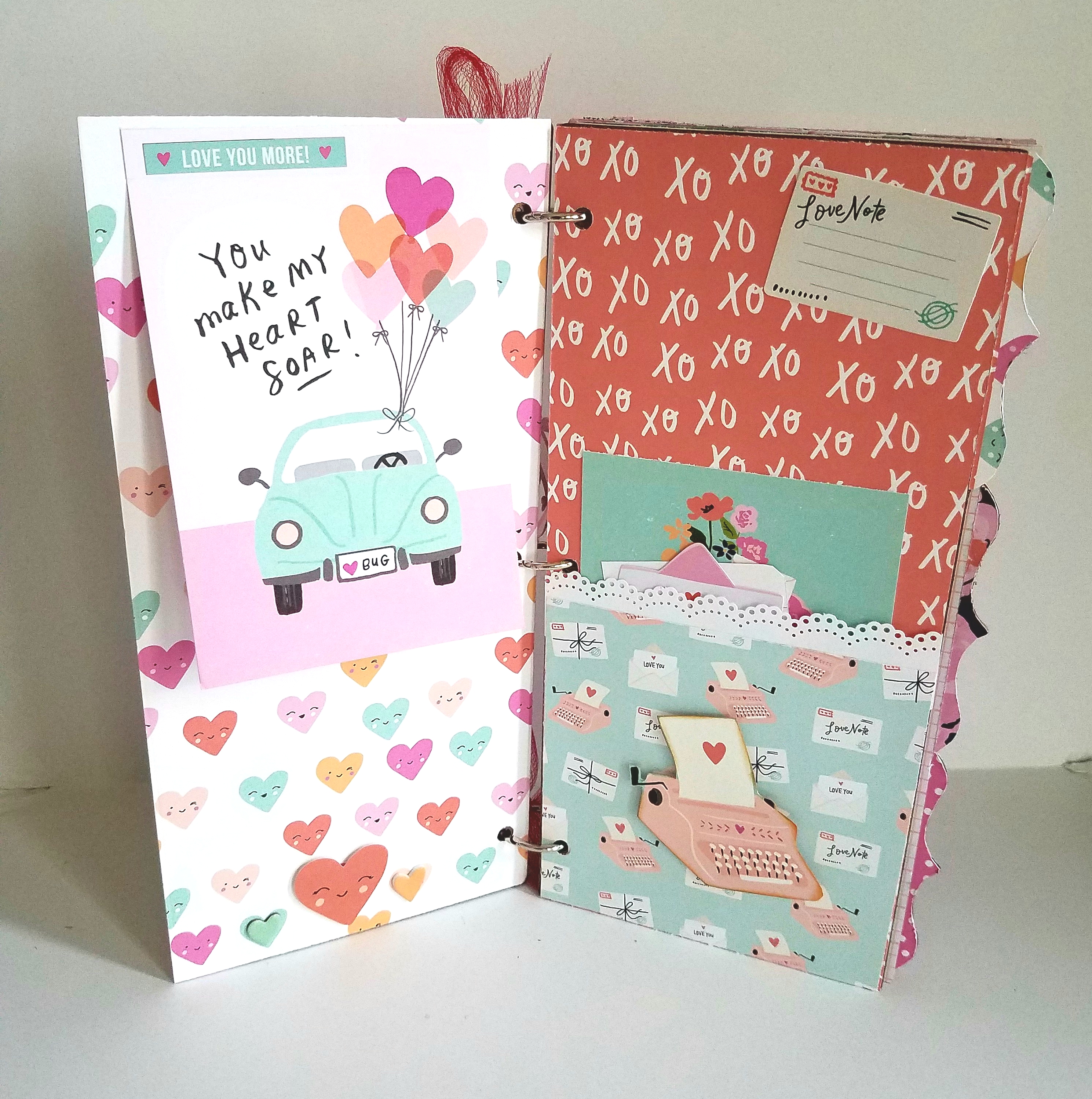 To finish my album I added some metal rings and tied with heart ribbon and red tulle.