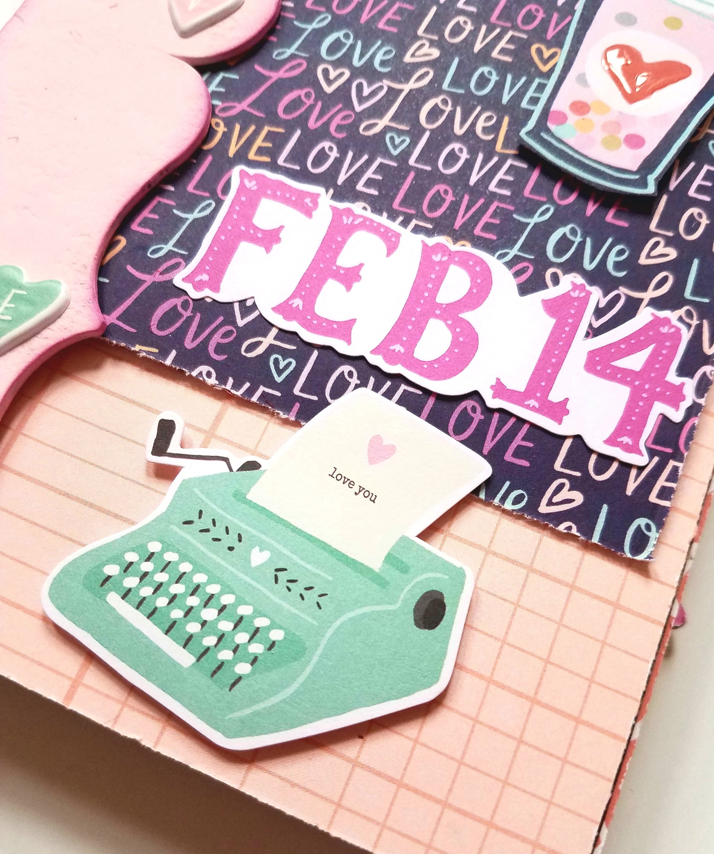 Next we can start decorating our front cover. I like to use a variety of ephermera, stickers and other embellishments. I cut my "Love" paper to measure 4×6 inches and adhered in the center of my album using foam tape. I fussy cut out the cappuccino image and applied to my paper using foam dots. I applied some Stickles glitter to the whipped cream on top. Then applied some Spectrum Noir Glossy highlights to the heart on my cup to add some dimension. I adhered the ephermera typewriter piece along the bottom of my page, using pop dots. The hearts and sentiment at the top.