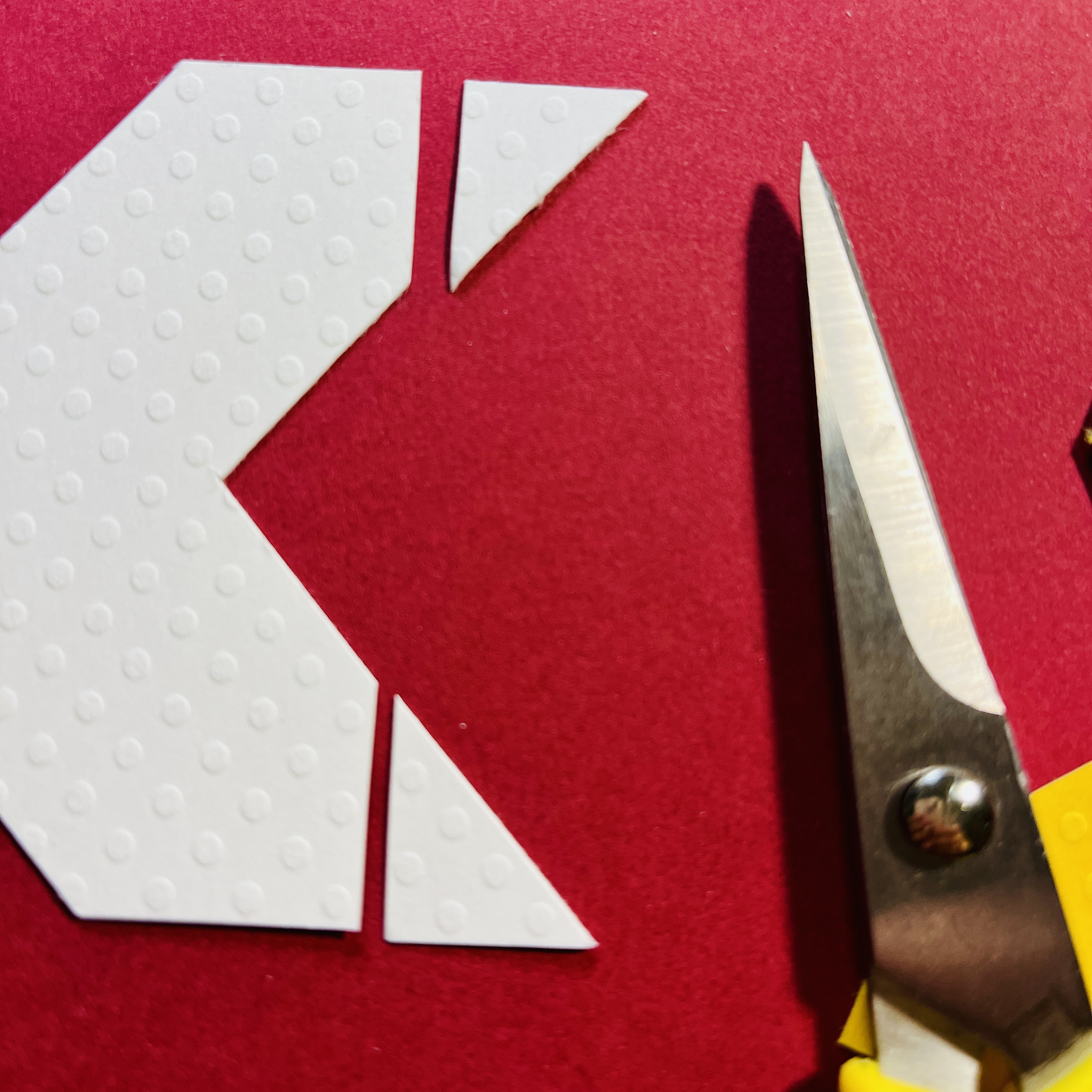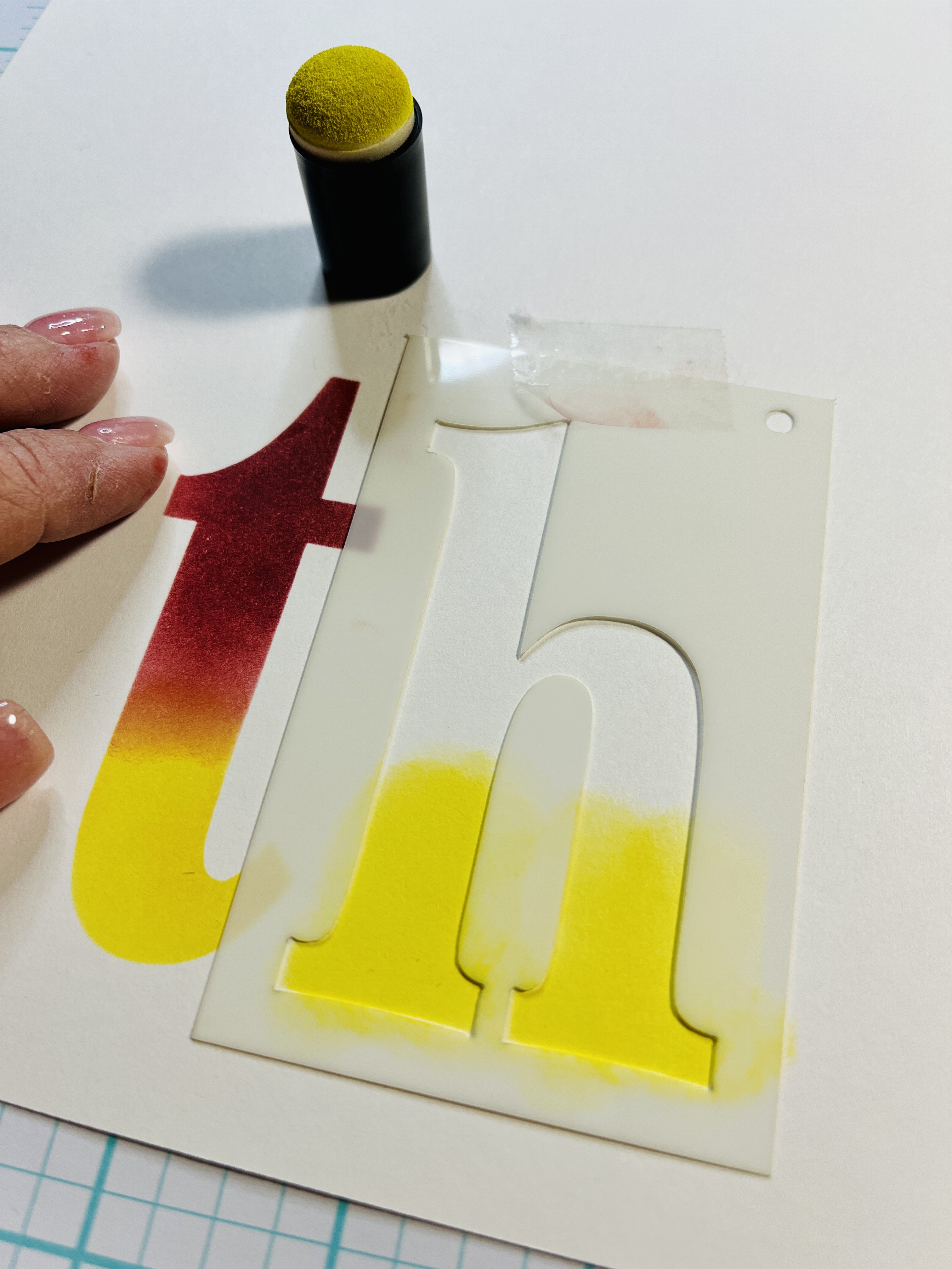 I started with the lighter color, the yellow, on the bottom. Then I sponged back over the stencil with the burgundy at the top. Let the ink run dry when you get to the middle, and I recommend a circular motion when you apply the ink. After the letters were done, I trimmed them with a small detail scissors.
