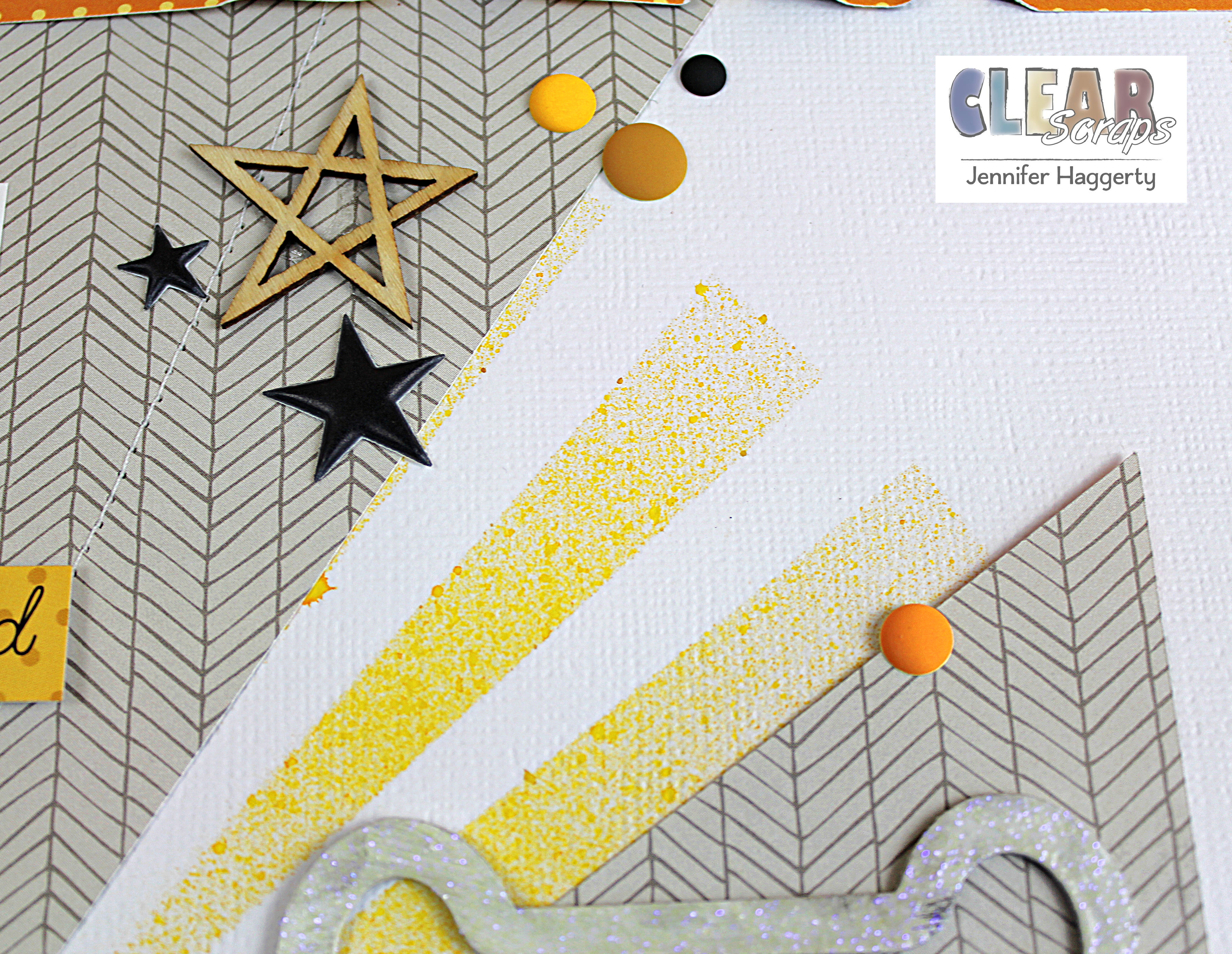 Here is a close up of the spray ink/Mascil effect; I paired it with a sunburst I cut from my Silhouette. I then added smaller embellishments such as epoxy stars and enamel dots.