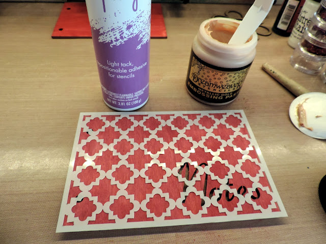 4×6 Quarterfoil Stencil was used to add design to the front. I used some Pixie Spray to hold the stencil in place and then added gold embossing paste.
