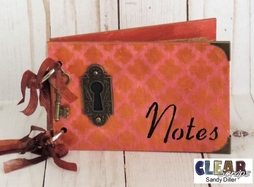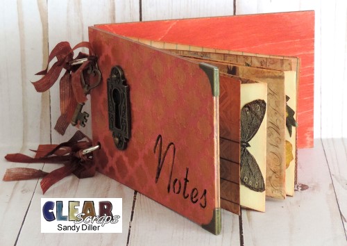 I will be the first to admit that I could be more organized, especially when it comes to my SD cards and thumb drives. I'm always looking around for which card I used last. I have decided to solve this issue by making this handy notebook to contain some of my mess. I used the Notes Wood Card from Clear Scraps to create a place to store my cards.