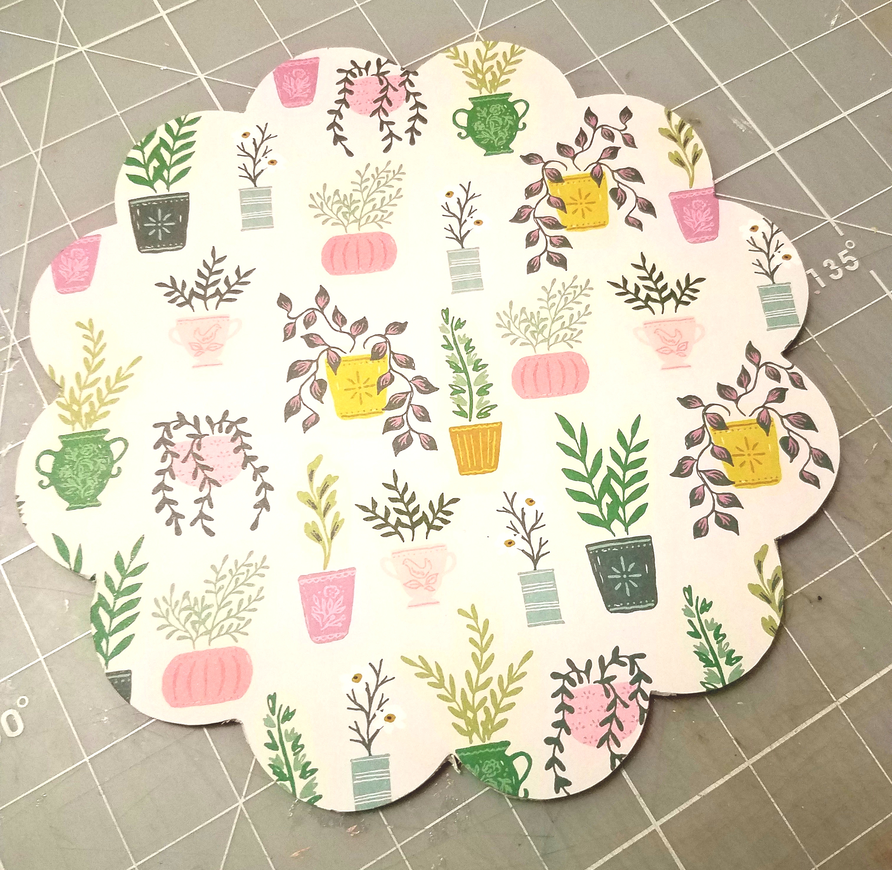 Then take another coordinating paper. Trace around your wood flower shape and adhere your paper to your flower shape using Beacon 3 in 1 glue. I trimmed and removed any excess paper from my wood flower shape, using an xacto knife. Then with my sanding tool, I distressed around all the edges until smooth.