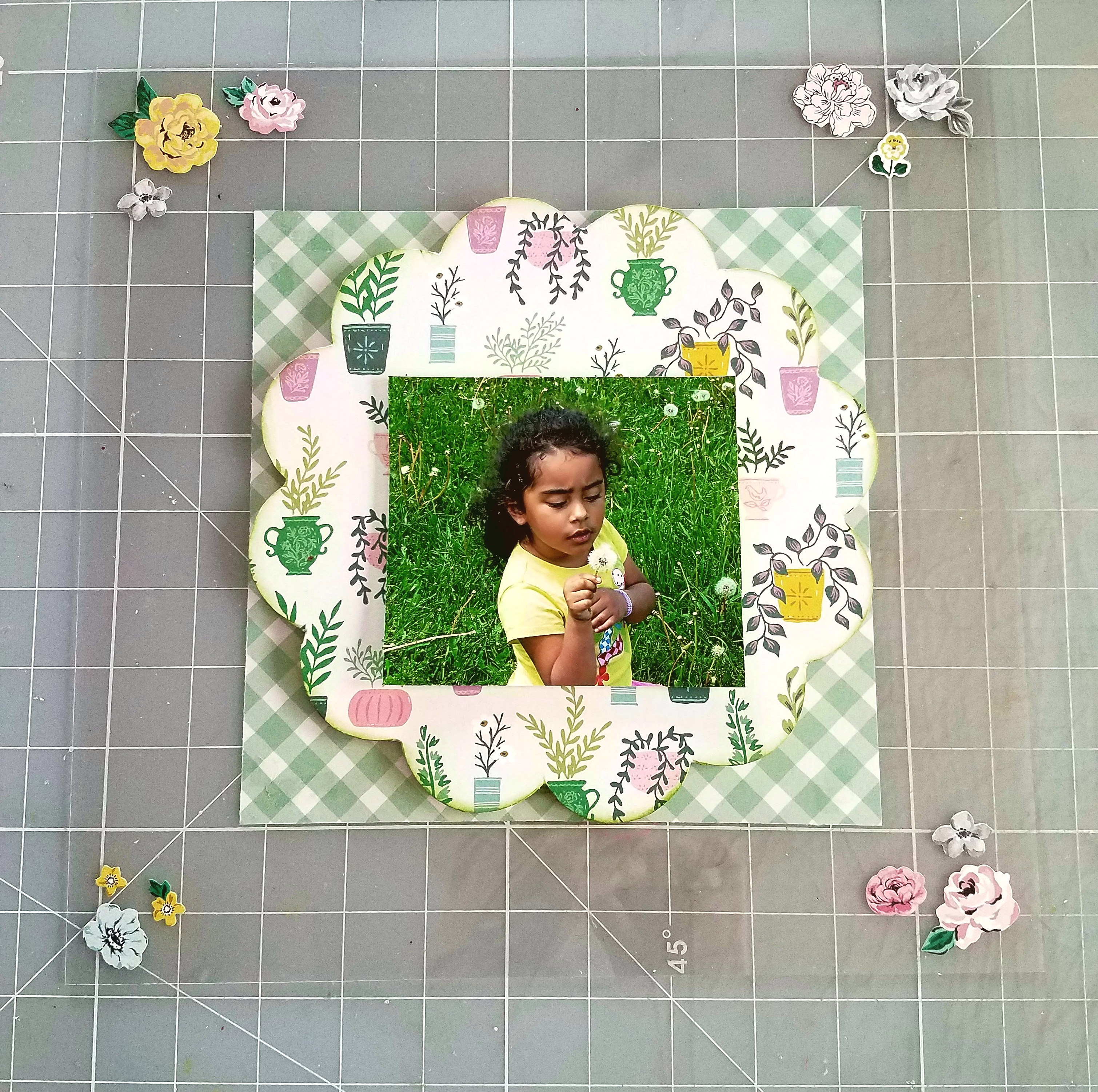 I applied foam squares on the back of my flower shape. I applied some green distress ink around the edges of my flower, before adhering to the center front side of my acrylic sheet. Then I added a photo in the center of my flower shape, using foam dots. I applied some flower stickers in all four corners of my acrylic sheet.
