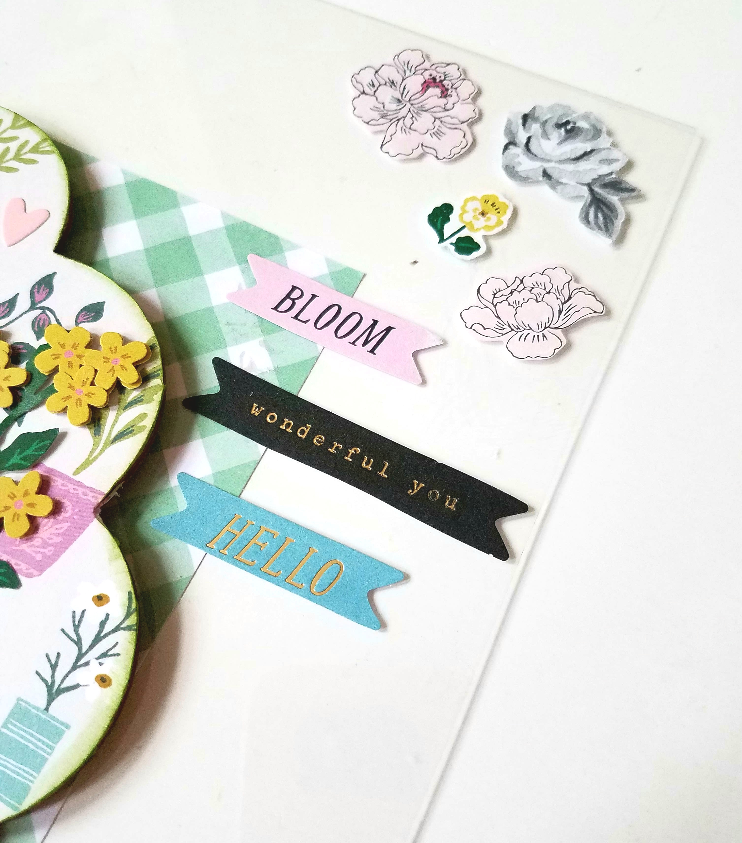 Other Supplies used: Maggie Holmes Garden Party collection, Tim Holtz Distress ink -Mowed Lawn, paper trimmer, scoring tool, Beacon 3 in 1 Glue, foam dots, vellum tape.
