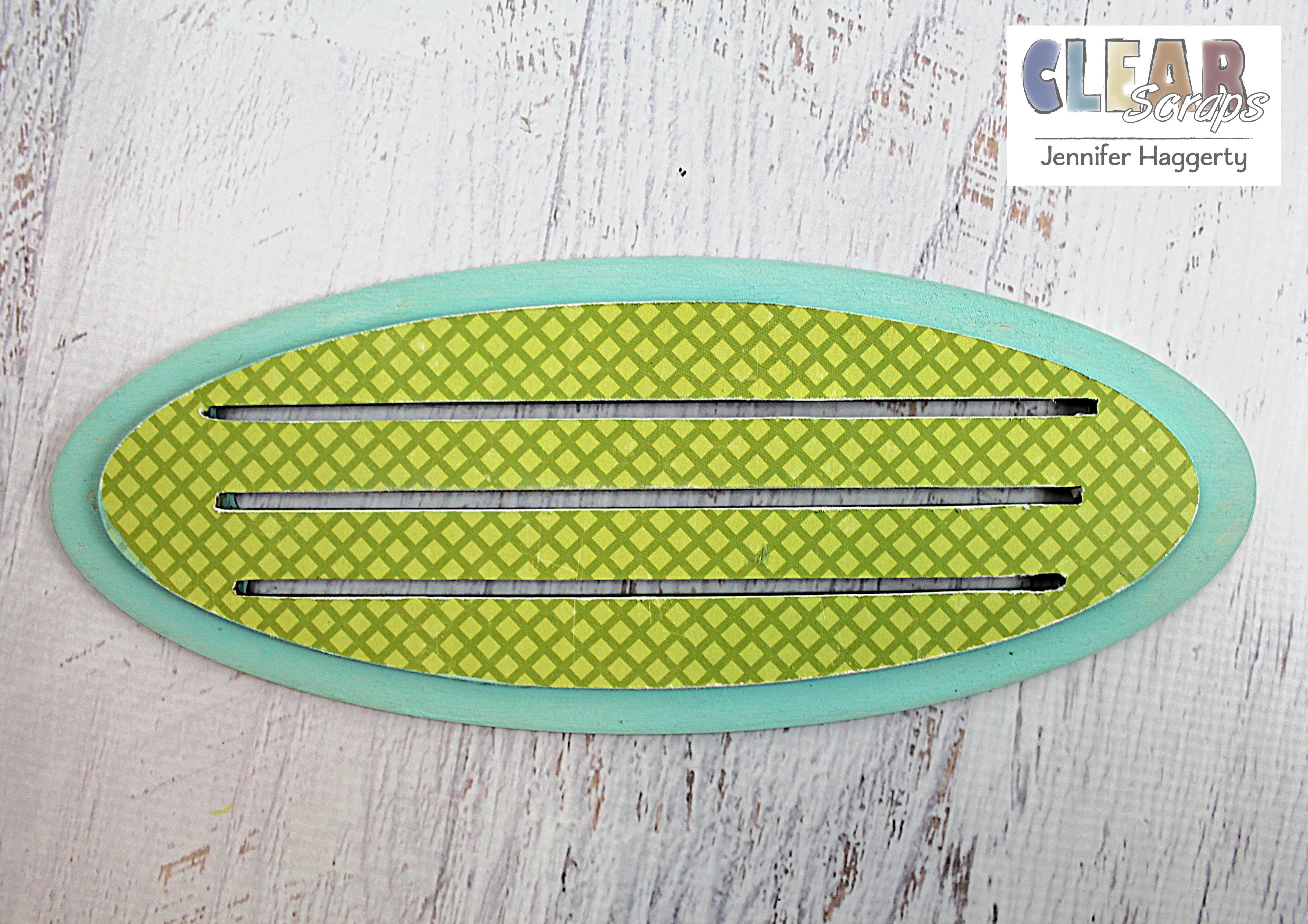 For my base, I used chalk paint in light blue for the larger oval. I then applied patterned paper to my smaller oval using Beacon 3-in-1 Adhesive. I then cut away excess paper with scissors and used an x-acto knife and sanding tool to smooth edges. I again used my Beacon to glue to the two pieces together.