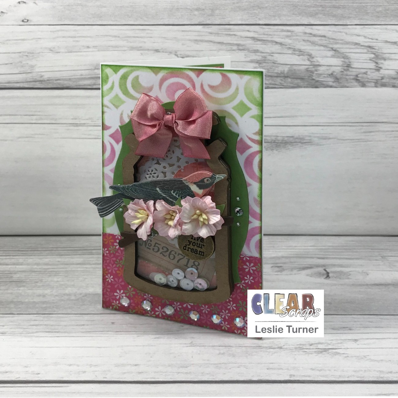 I cut a mini slimline card base from heavyweight white cardstock along with layering panels from a lighter weight white cardstock and patterned paper. Using the 5×9 Circles Dots Stencil with a dauber and green and pink distress inks, I stenciled the design on the white cardstock panel. I adhered the short patterned paper panel to the bottom, inked the edges, and adhered the panel to the card base. I die cut a shape from green cardstock using a labels die and adhered it to the card front. I adhered the finished shaker along with some iridescent gemstones which completed the front of the card.