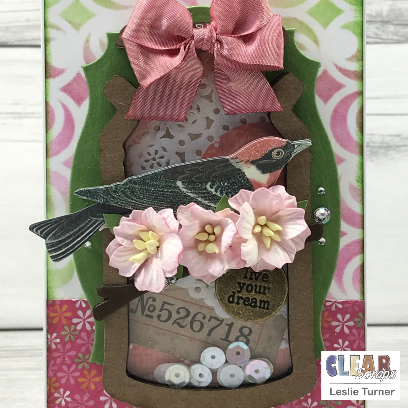 Let me start with an up-close shot of the Mini Shaker Milk-Can which I created first. Several of the embellishments are recycled from a tag I received from a friend a number of years ago. The tag was adorable so I kept it… but it got damaged and I didn't want to throw it away, so I salvaged the bow, the bird and the ticket. I adhered patterned paper on the chipboard back along with a small paper doily, a punched circle from another patterned paper, and the ticket. I adhered the next two chipboard forms, added white sequins, and adhered the acrylic divider (with the protective film removed) along with the remaining chipboard form. I adhered the bird on a die cut branch, three paper flowers, a charm, and the bow with hot glue.