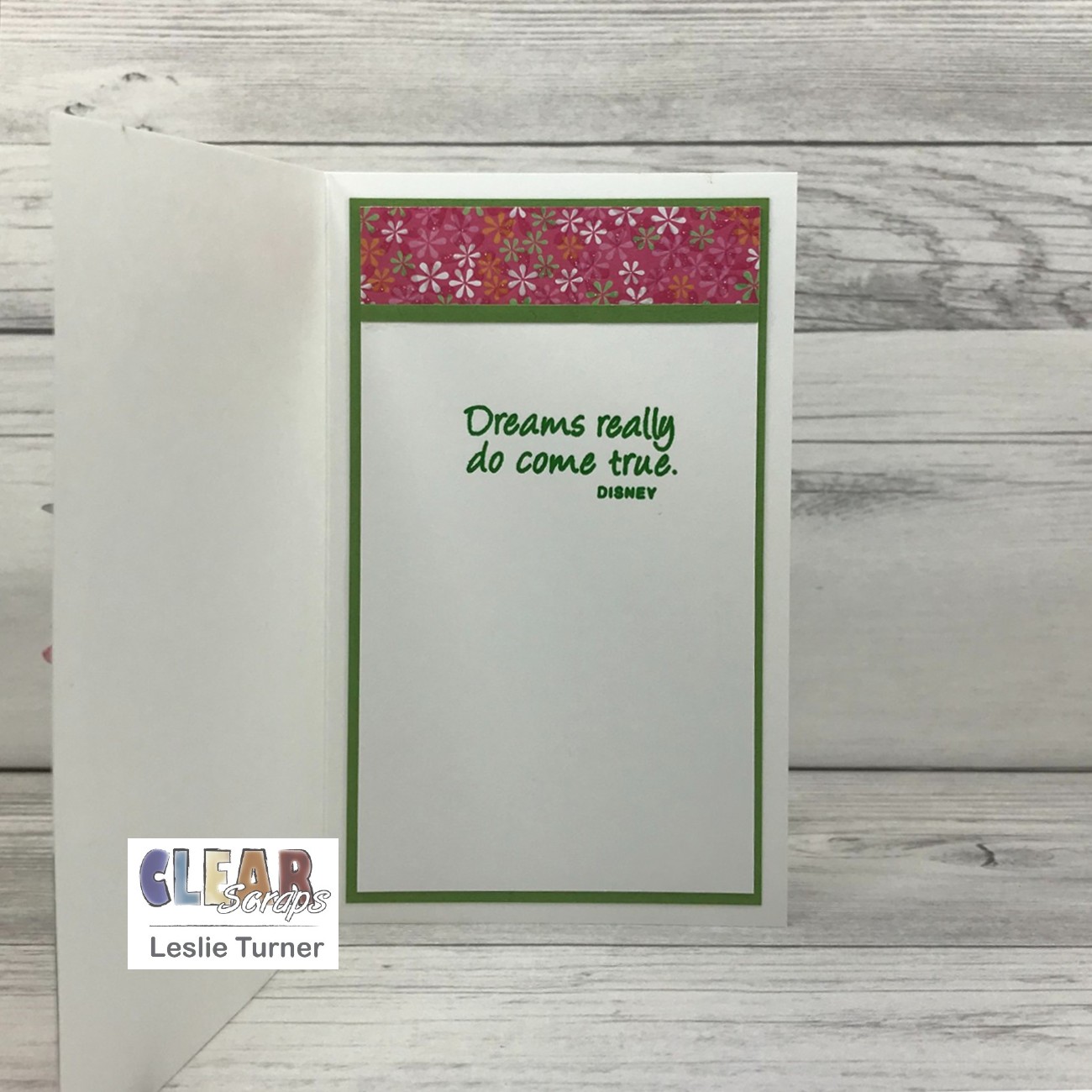 I cut the inside panel from white cardstock and embellished it with the patterned paper used on the front and a narrow strip of green cardstock. I stamped the sentiment in green ink and layered the panel on green cardstock.