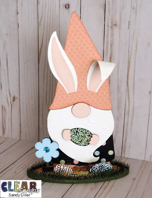 It's Sandy Diller here today to share a fun little Easter project with you that I hope will bring a smile to your face. This adorable Medium Wood Gnome 2 is from Clear Scraps and all I did was add some cute paper, bunny ears and some Easter eggs. I hope you like it. Our little friend has been on a successful Easter Egg Hunt.