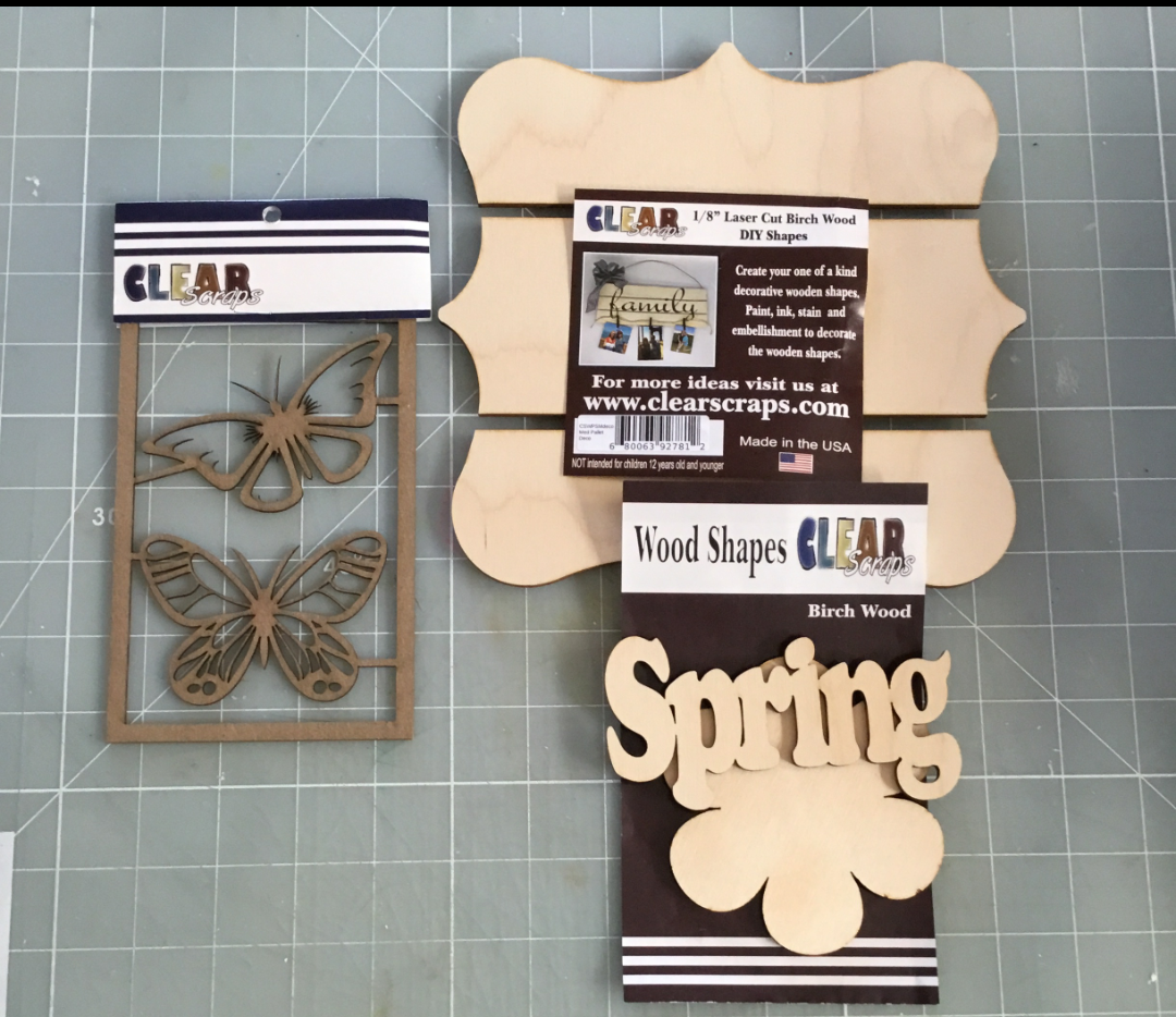 For my project today we will be using several products from Clear Scraps, medium wood pallet, Deco, Click Here chipboard fancy butterflies, Click Here and spring/flower wood shapes Click Here