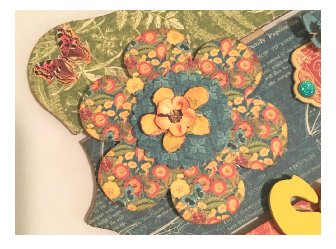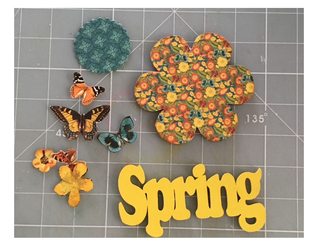 Fussy cut some of the butterflies and flowers from other papers in your paper pad. Ink edges. I took a scalloped die from my craft stash and diecut from another coordinating paper and set thede aside.