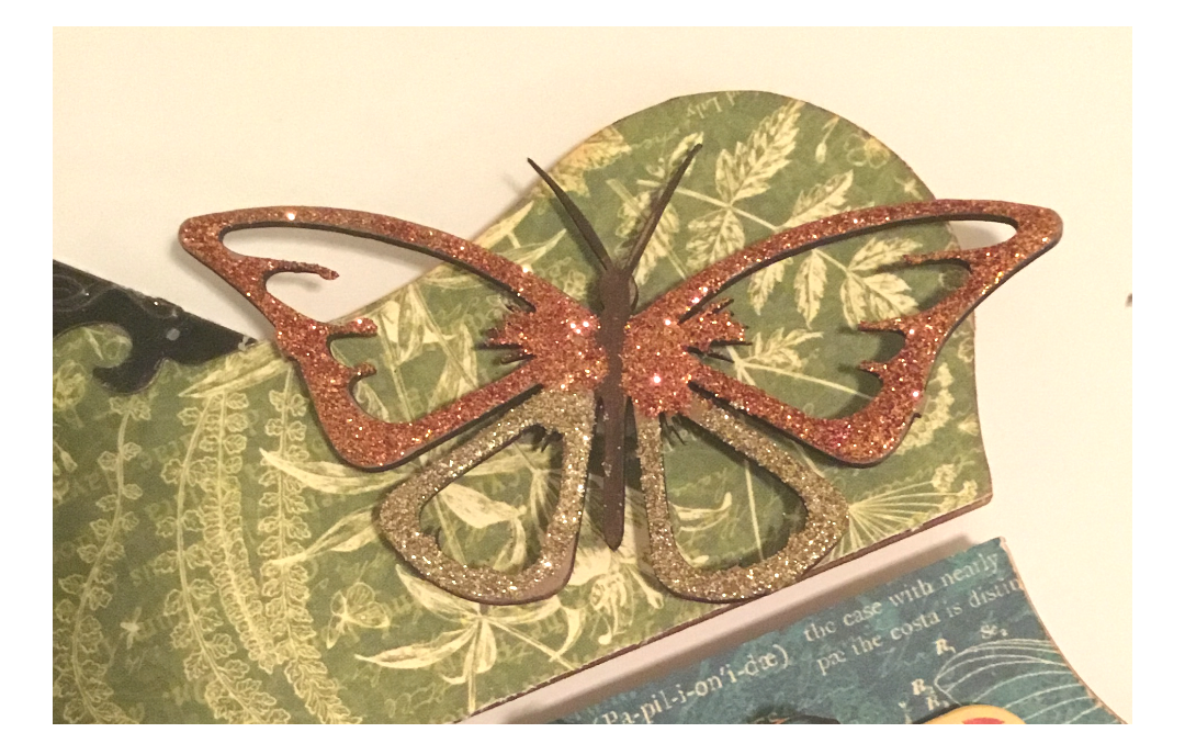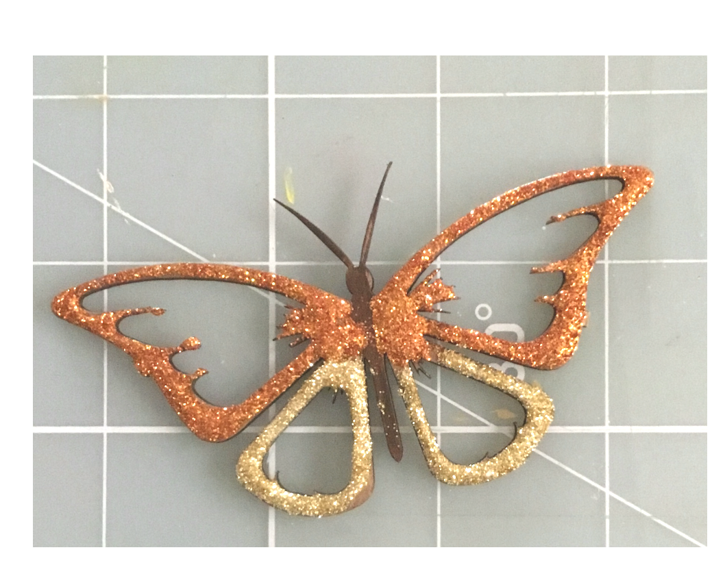 Now cut apart one of your Clear Scraps fancy butterflies from the package. You can save the other butterfly for a future project. I took acrylic paint in brown and painted the butterfly body and antennas. Let dry. Then I applied glue onto the wings of my butterfly and sprinkled Fire opal and gold glitters onto the butterfly wings. Shake off any excess glitter and set aside to dry.