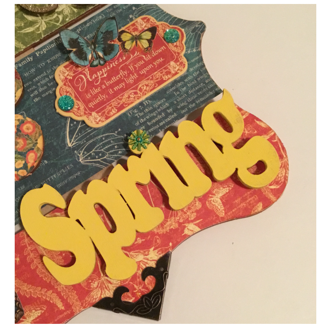 I then arranged my other embellishments onto my wood pallet. Once I was satisfied with the placement, I adhered onto my pallet with Beacon glue. For my chipboard butterfly and spring wood words, I added some foam dots to the back before adhering onto my pallet. I added a crystal flower gem over the dotted "i" on my spring words. I glued my fussy cut butterflies onto my pallet and added a chipboard sticker sentiment in addition to crystals gems over the holes of my chipboard sentiment piece.