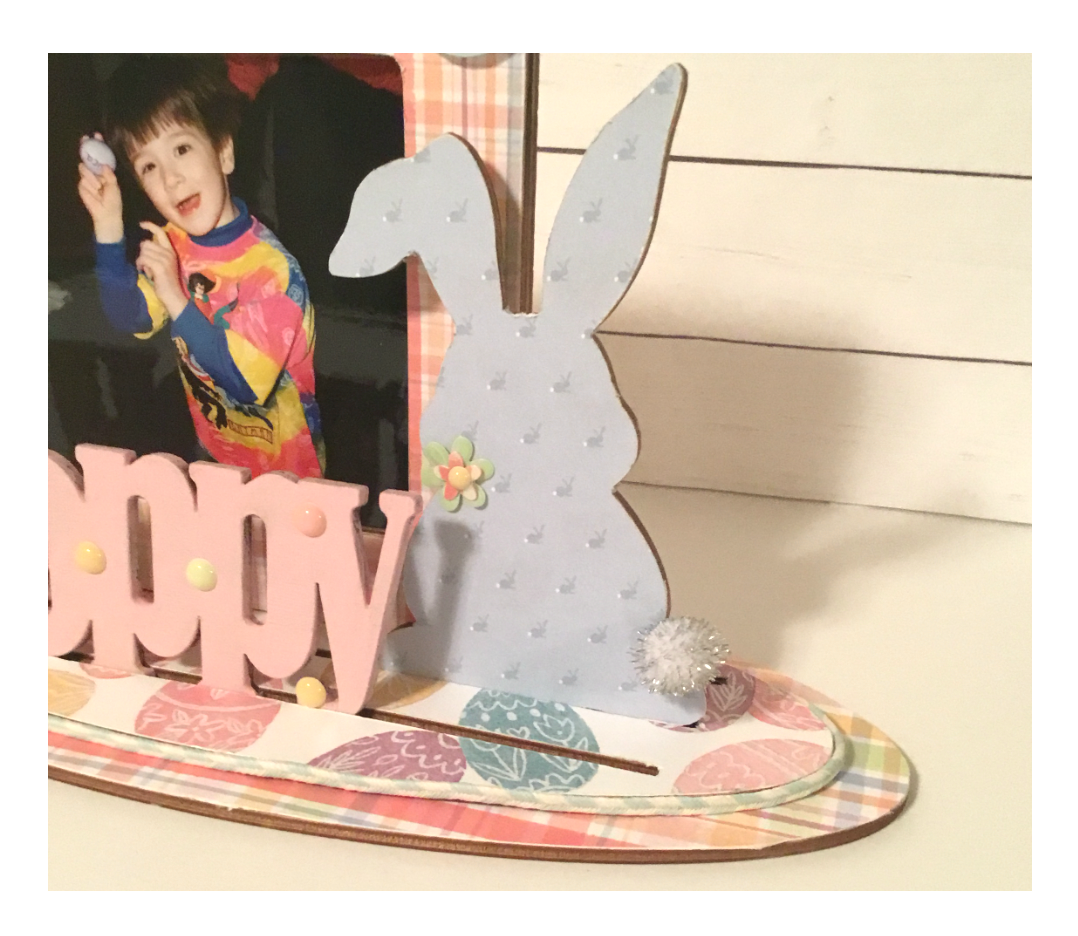 I decorated my frame adding foam dots to the back of my Easter sticker letters and adhered along the top of my frame. Then added acouple egg stickers to the left side of my frame.