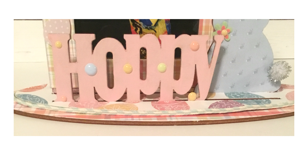 Next take your Hoppy wood words and cover front and sides using a light pink acrylic paint. Once dry I added several enamel dots to my Hoppy words.