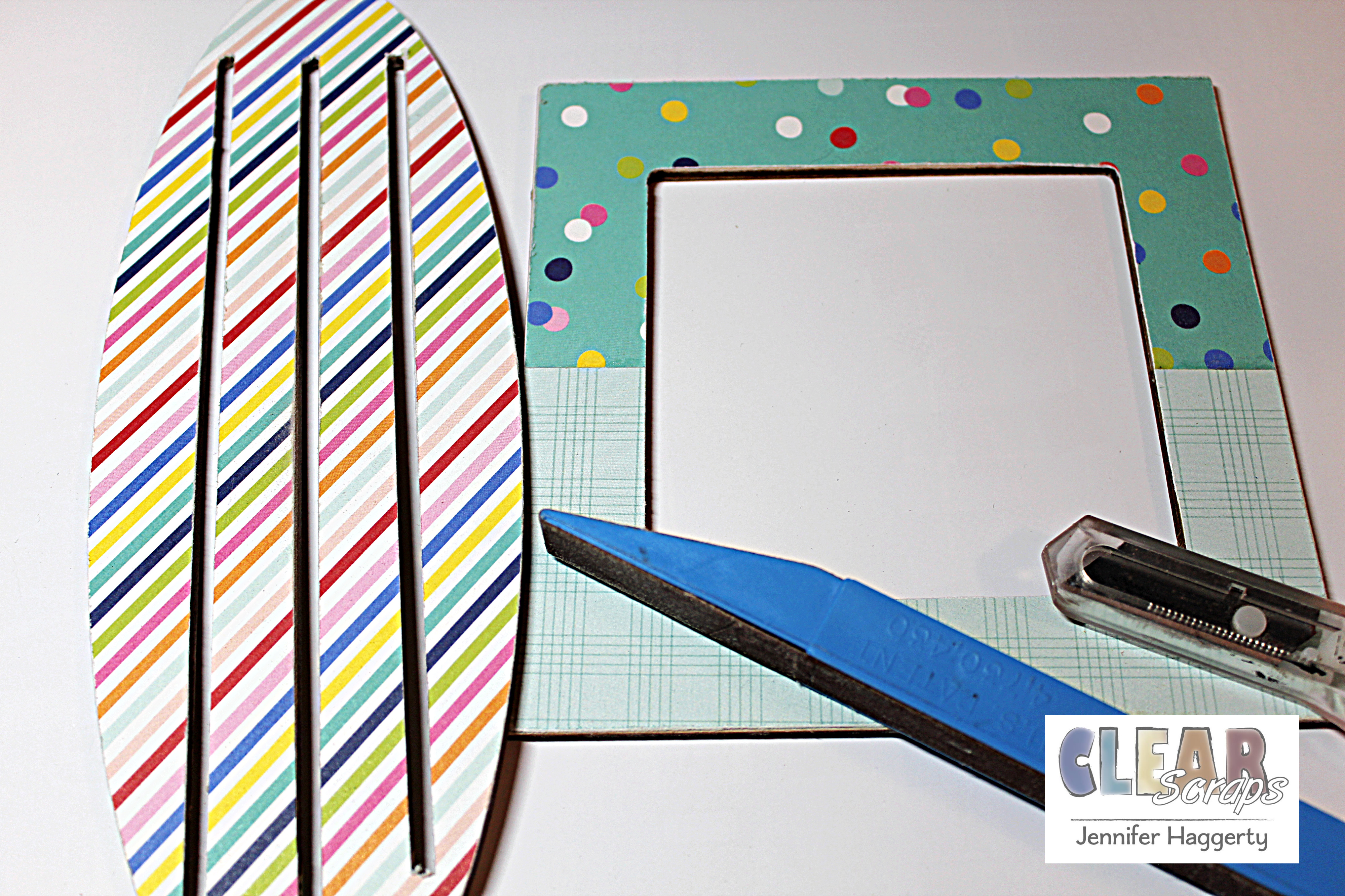 Using my Beacon 3-in-1 Adhesive, I covered the Square Frame and smaller oval of the base with patterned paper. I cut away excess paper with scissors followed by using an x-acto knife with a healing mat. I then smoothed edges using a sanding tool.