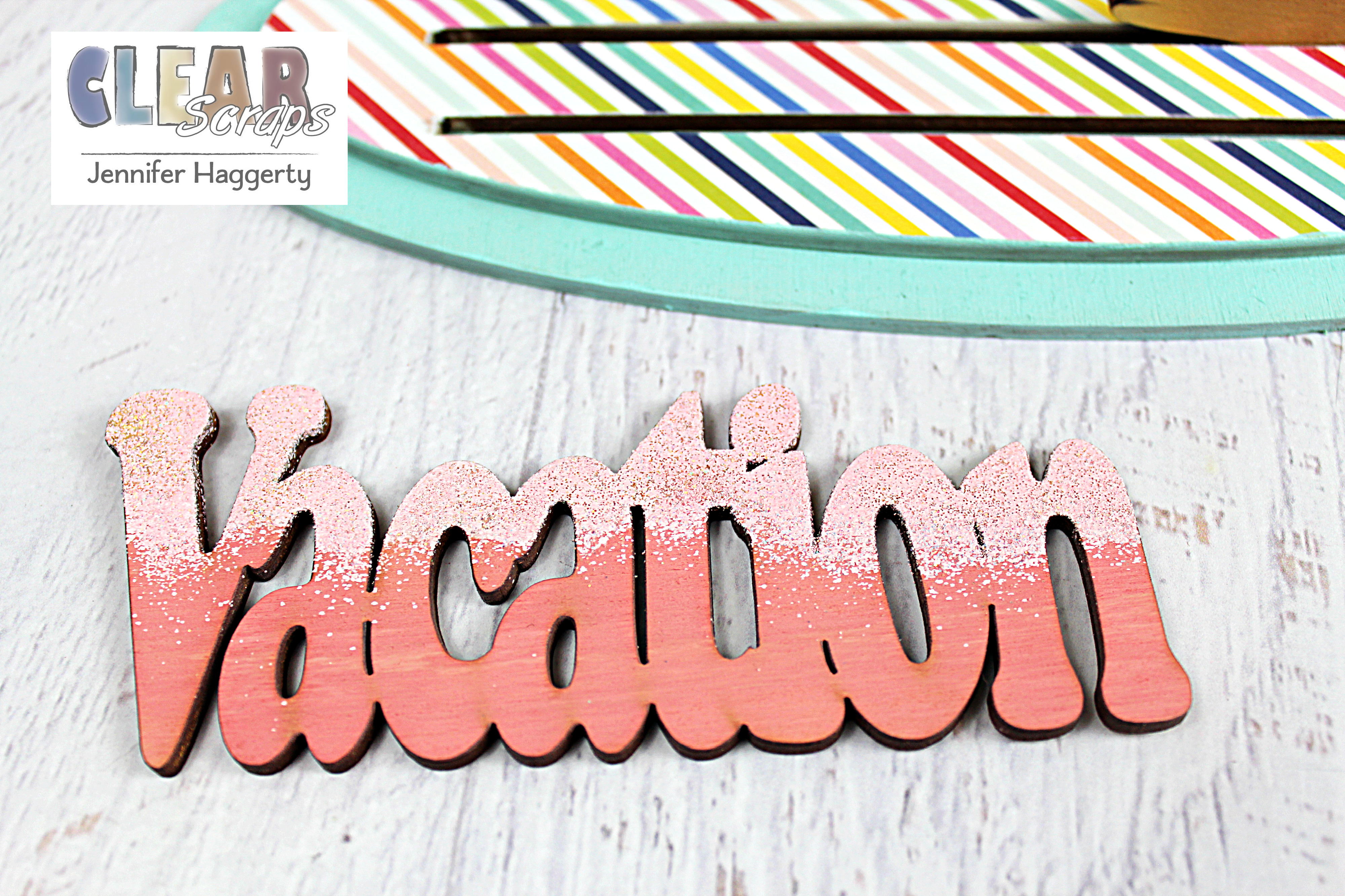 I then applied embossing ink to the top third of the wood word followed by using pink glitter embossing powder. I set the powder using a heat tool.