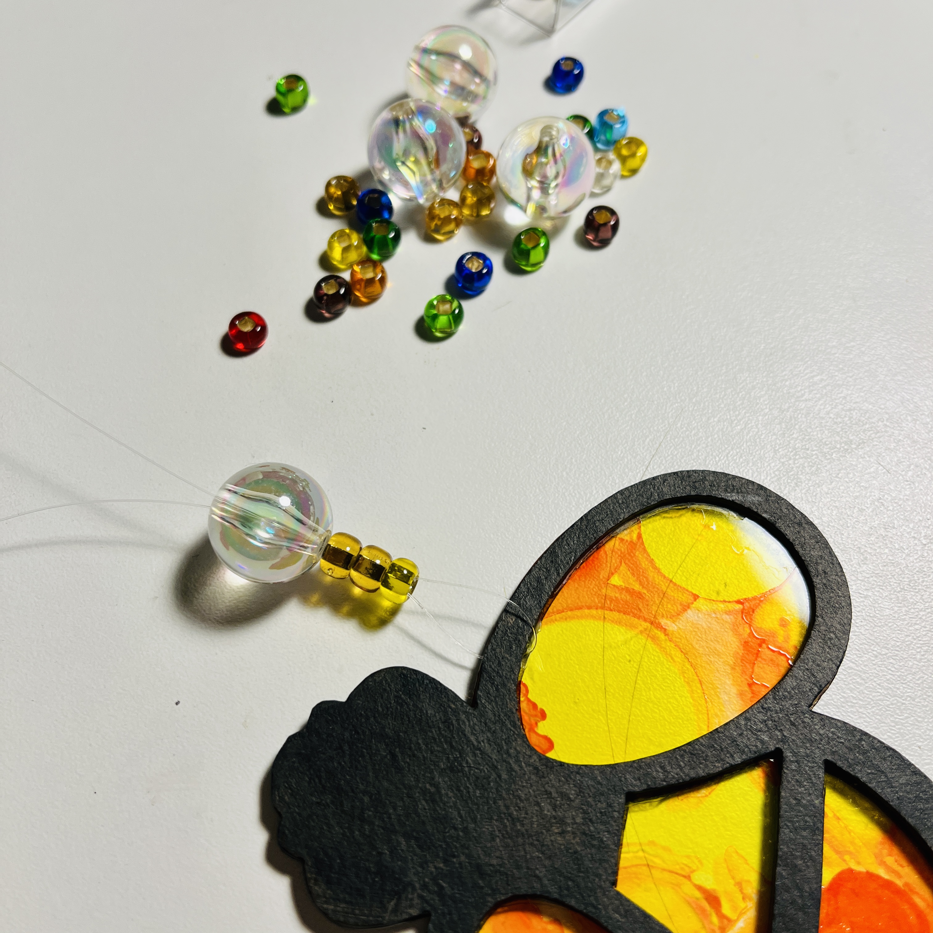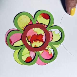 Additional supplies: Ranger alcohol inks and blending solution, gloves, protective plastic or paper, paper towels, acrylic paints, fishing wire, assorted beads