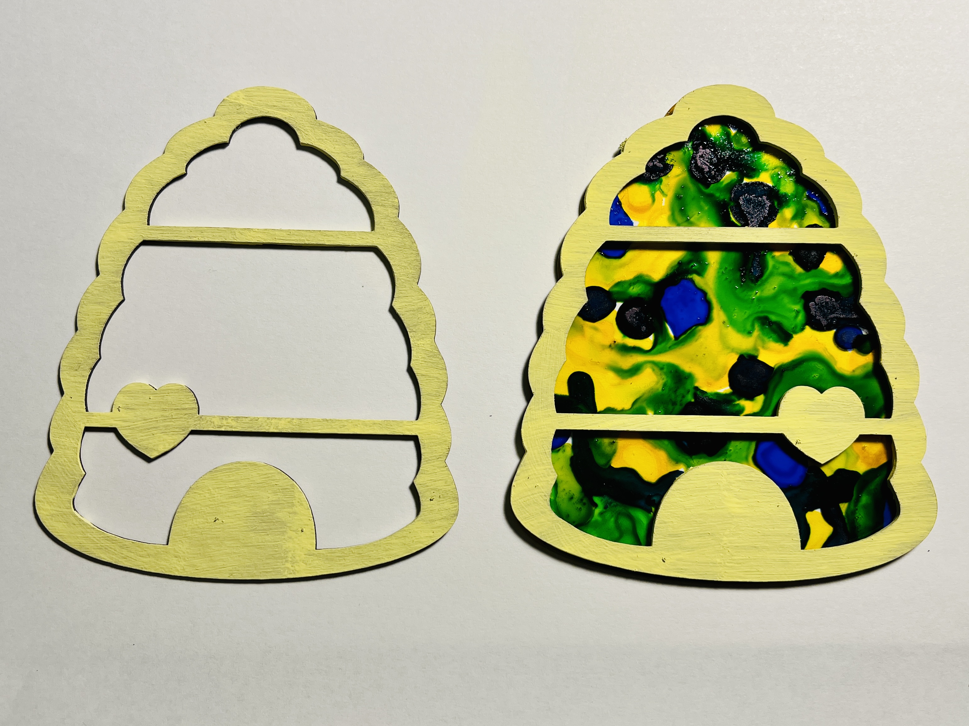 While my panels dried, I painted a front and back chipboard piece for each shaker in assorted acrylic paints. Since this project will spin around, it's important to paint both sides. Also – a friendly reminder: for pieces like the bee hive, make sure you are pairing them up as a mirror image. That will allow you to glue them back-to-back.