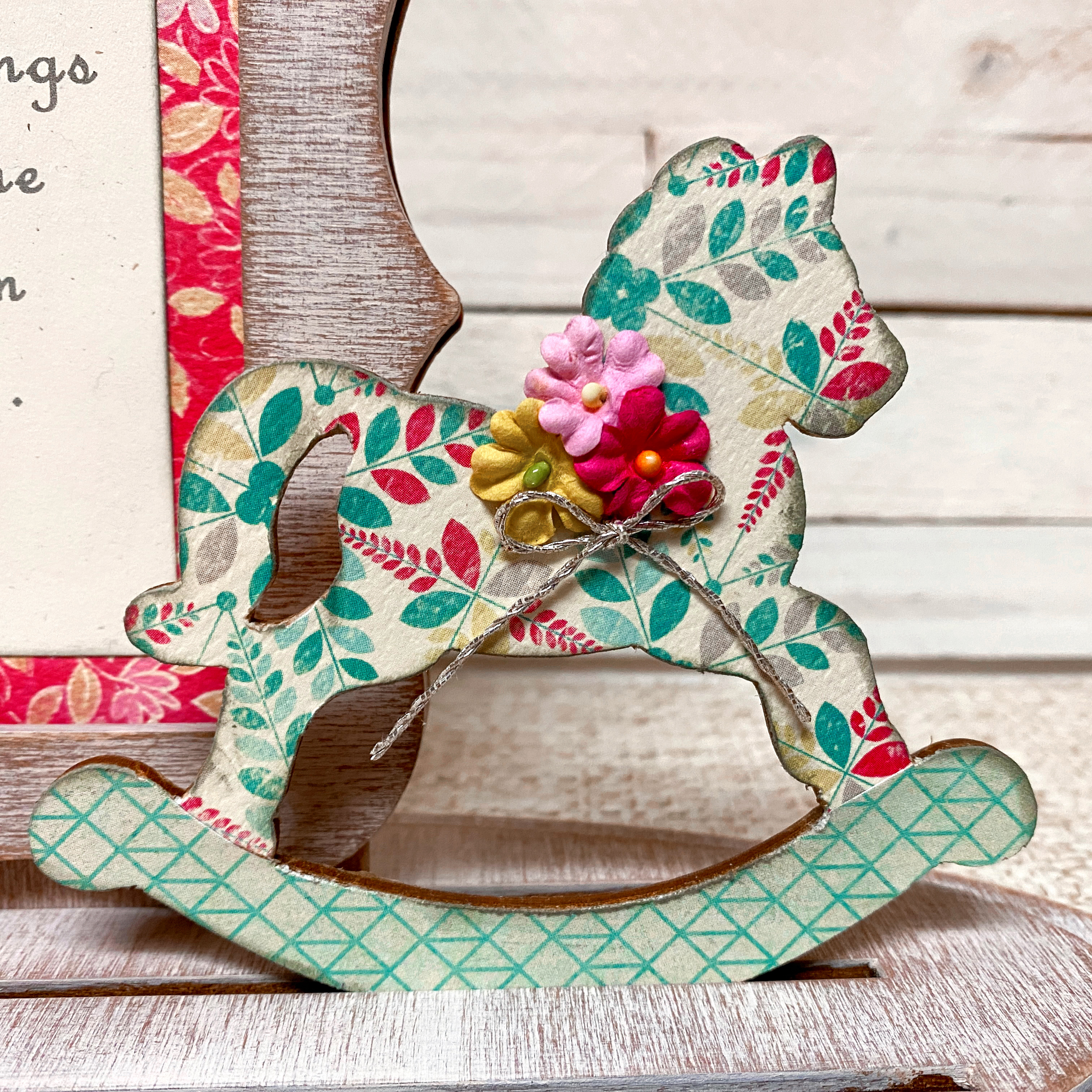 I used two different printed papers on the rocking horse, then added some tiny flowers with silver cord to embellish it…