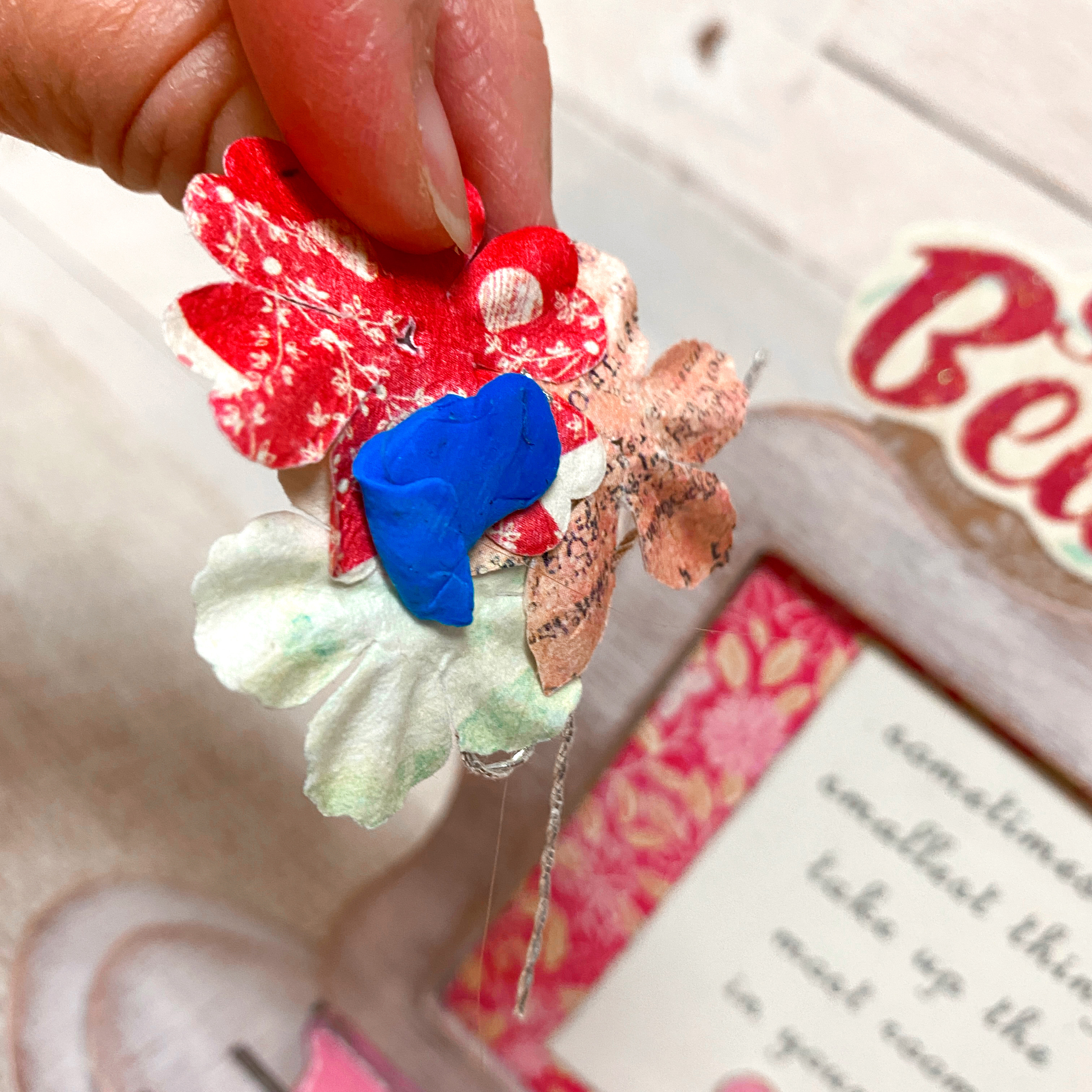 I wanted to add a few more flowers to accent the frame, but I wanted them to be removeable as well, so I adhered the flowers together and let them dry. Then used a bit of poster tac to add them to the frame…