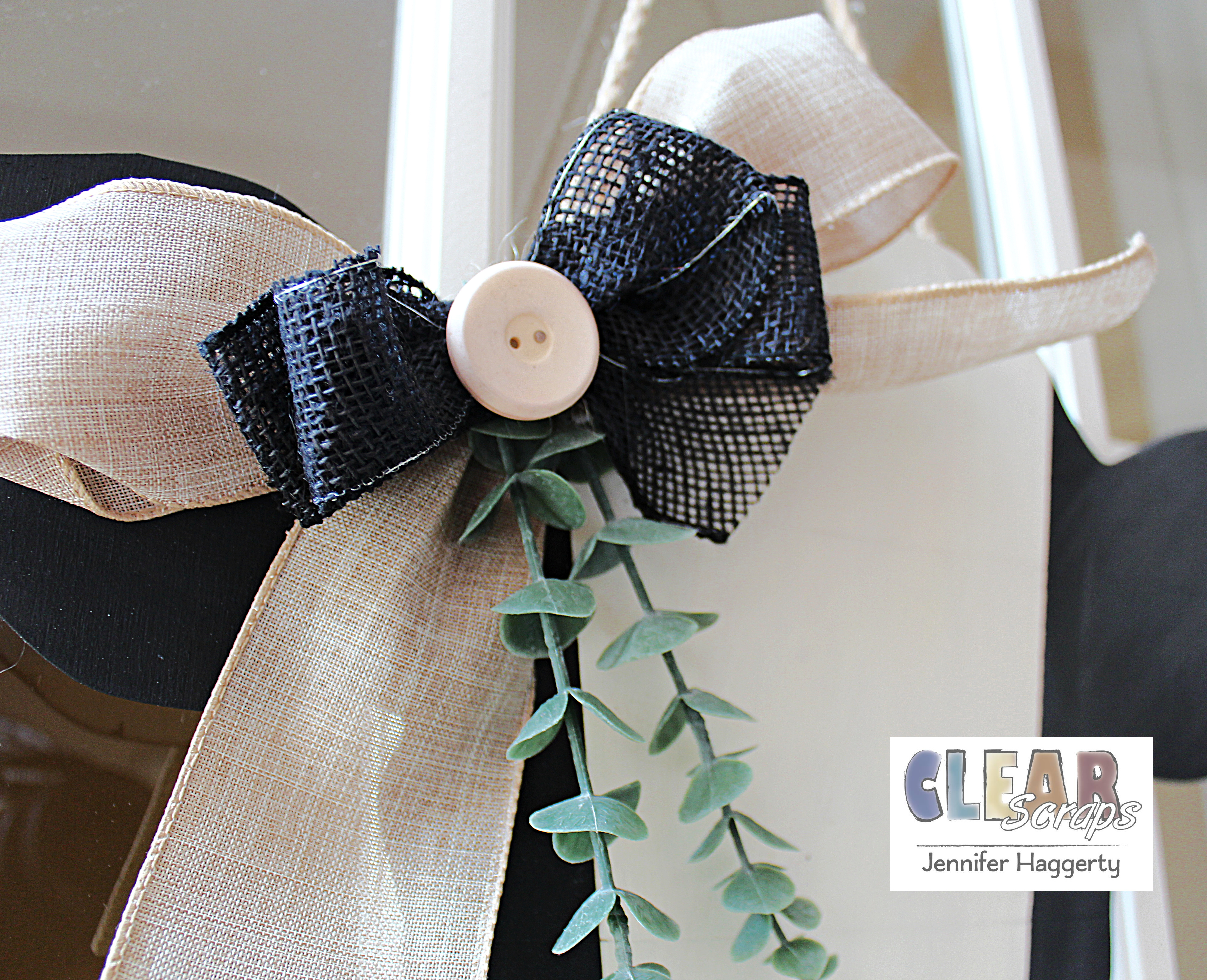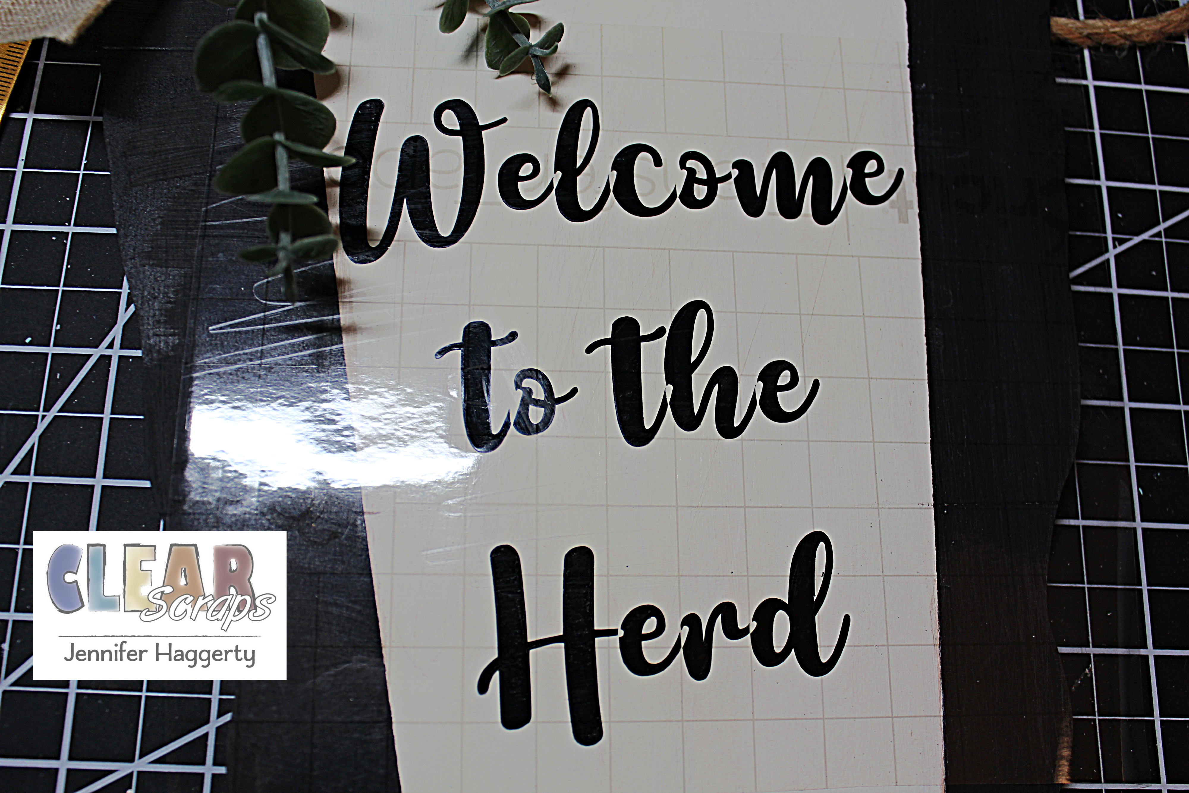 Additional products used: paint: FolkArt; vinyl, tranfer tape: Cricut: misc: ribbon, eucalyptus, button, hot glue gun, painters tape.