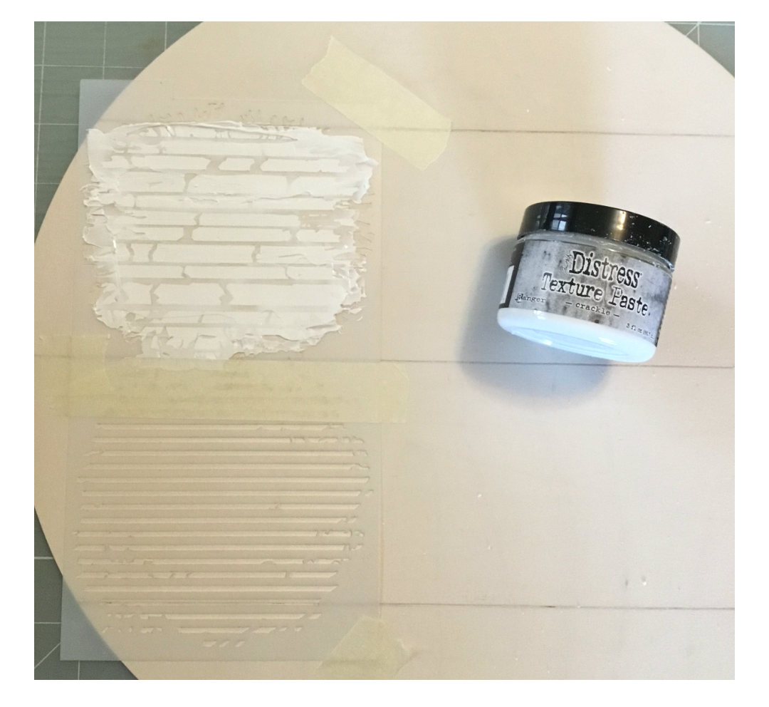 Next I taped my Clear Scraps New Grunge Brick stencil Click Here in place onto my wood surface. Then with my pallet knife I spread some Crackle texture paste over my stencil. Scrape off any excess. Carefully lift off your stencil and let dry. I repeated this step on another section of my wood surface. Let your crackle dry throughly overnight before you go to the next step. I recommend you don't use a heat tool to dry the crackle. You'll get better crackle results letting it air dry.