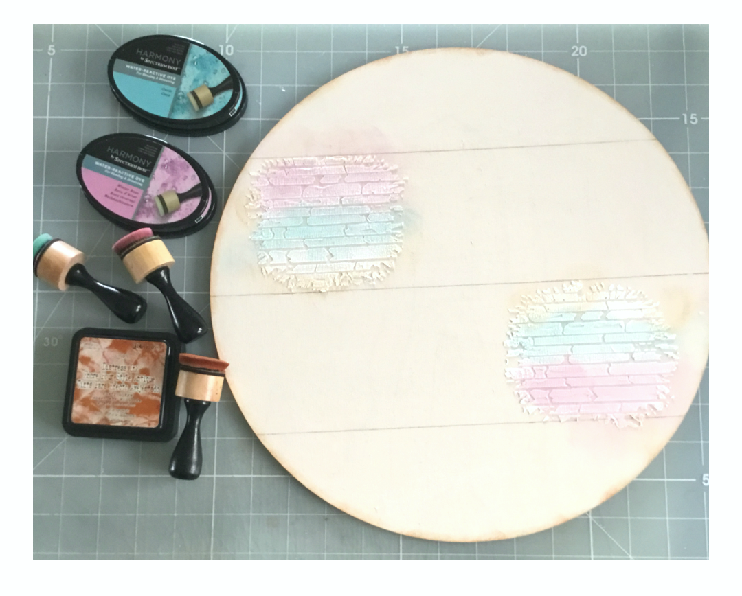 Now we can add some color to our crackle stenciled surface. I chose to use Spectrum Noir inks and a Distress ink along with an ink dabber and gently rubbed three different color inks over my stenciled areas.