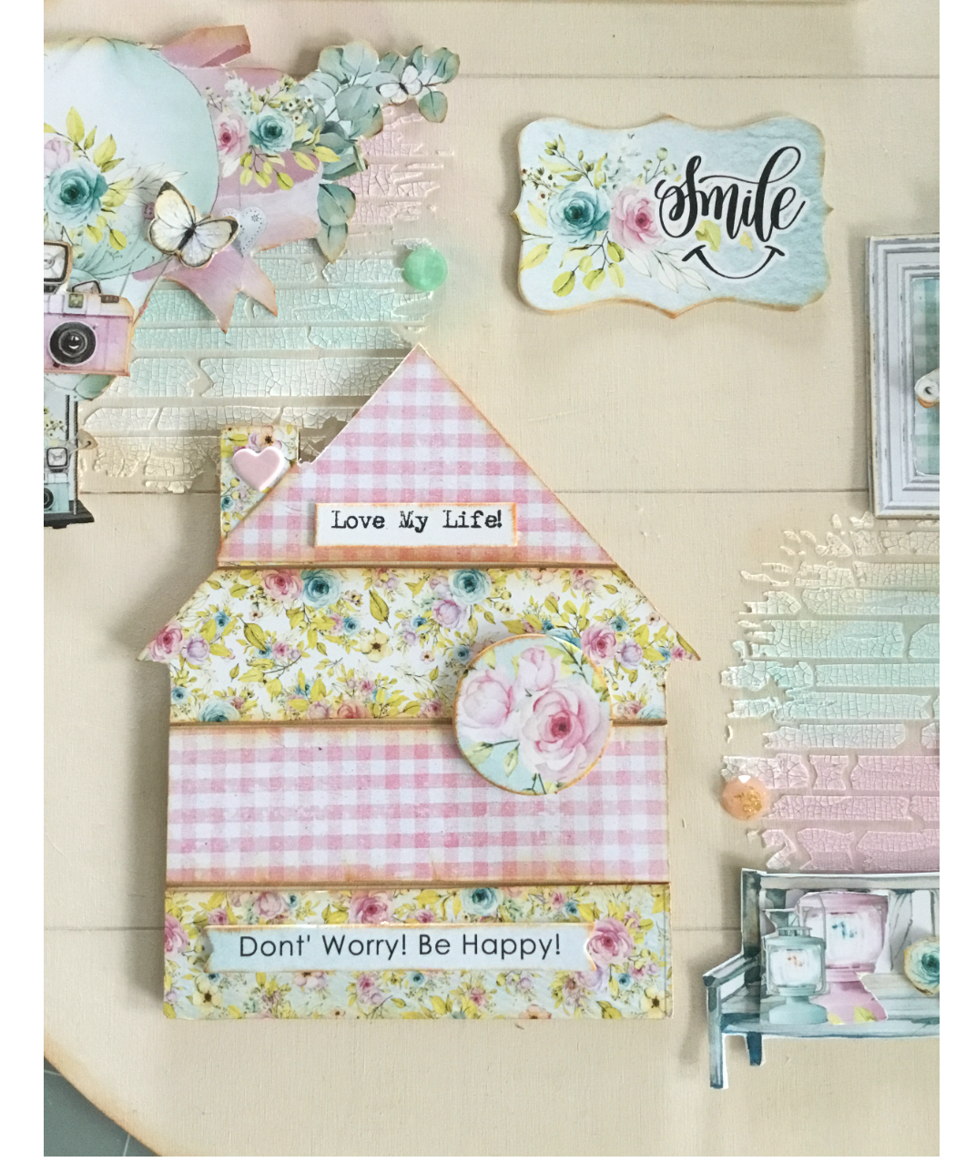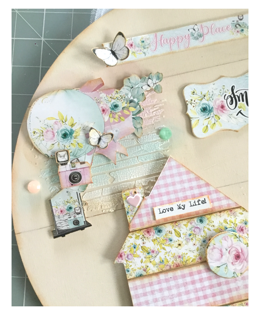 Now the fun part is decorating your Shiplap Shape! I fuzzy cut some images from my papers and inked around all the edges. I like to arrange the placement of my pieces, before adhering them to my project. I added foam tape to the back of my Shiplap house shape before adhering down onto my round Shiplap piece. This adds some dimension which I love. I added foam dots to some of my embellishments and some matching stickers. Then I added a few crystal gems in scattered areas on my project. Added alittle glitter to my butterflies wings!