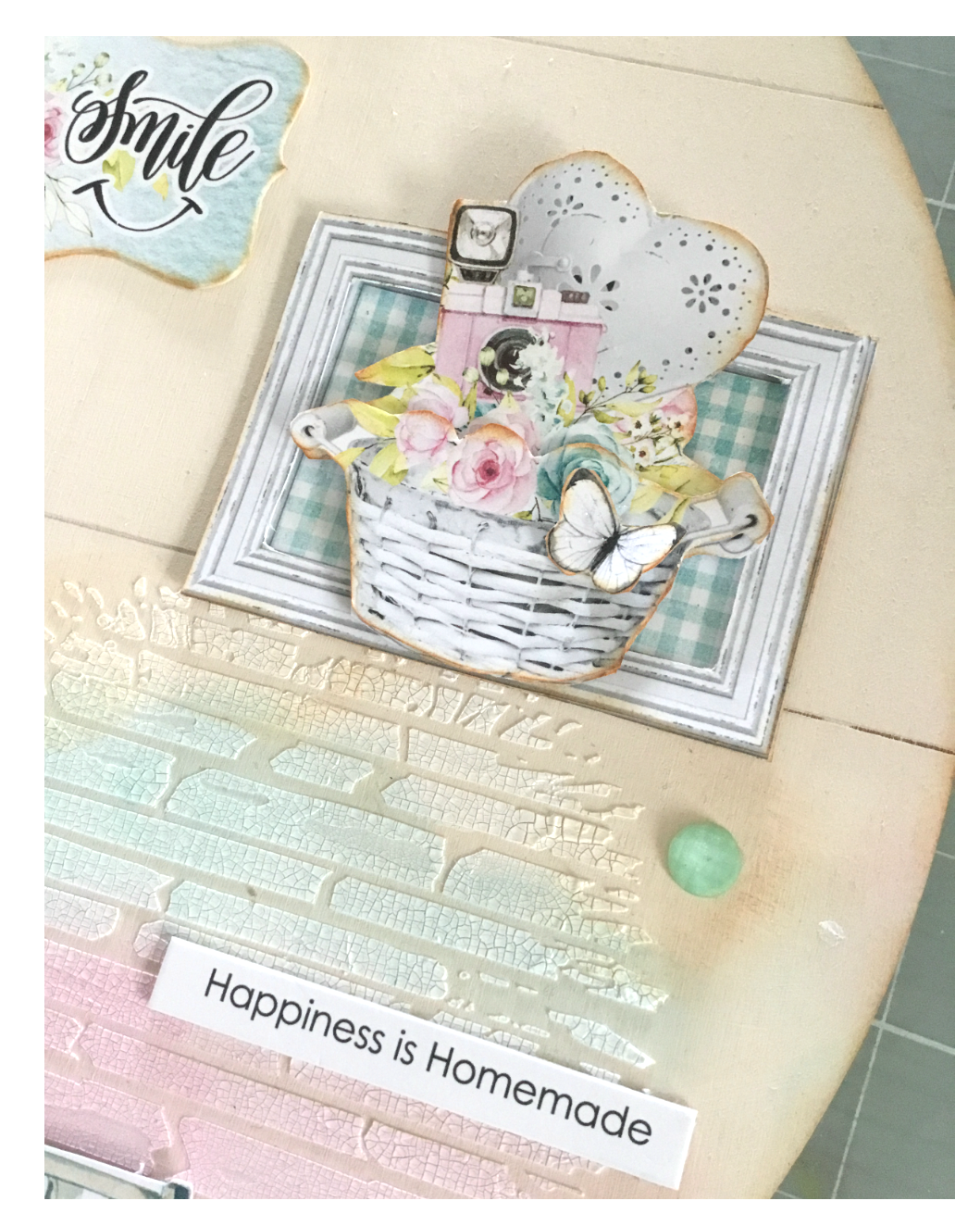 Other Supplies used: Spectrum Noir Harmony Inks: Winter Rose and Oasis, Distress ink Rusty Hinge, Ranger Texture Crackle Paste, X-acto knife, sanding tool, Mintay My Happy Place paper collection, Stickles glitter-diamond, foam dots, foam tape, Prima crystals, Folk art Chalk paint Milkjug