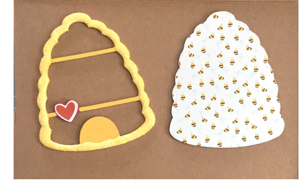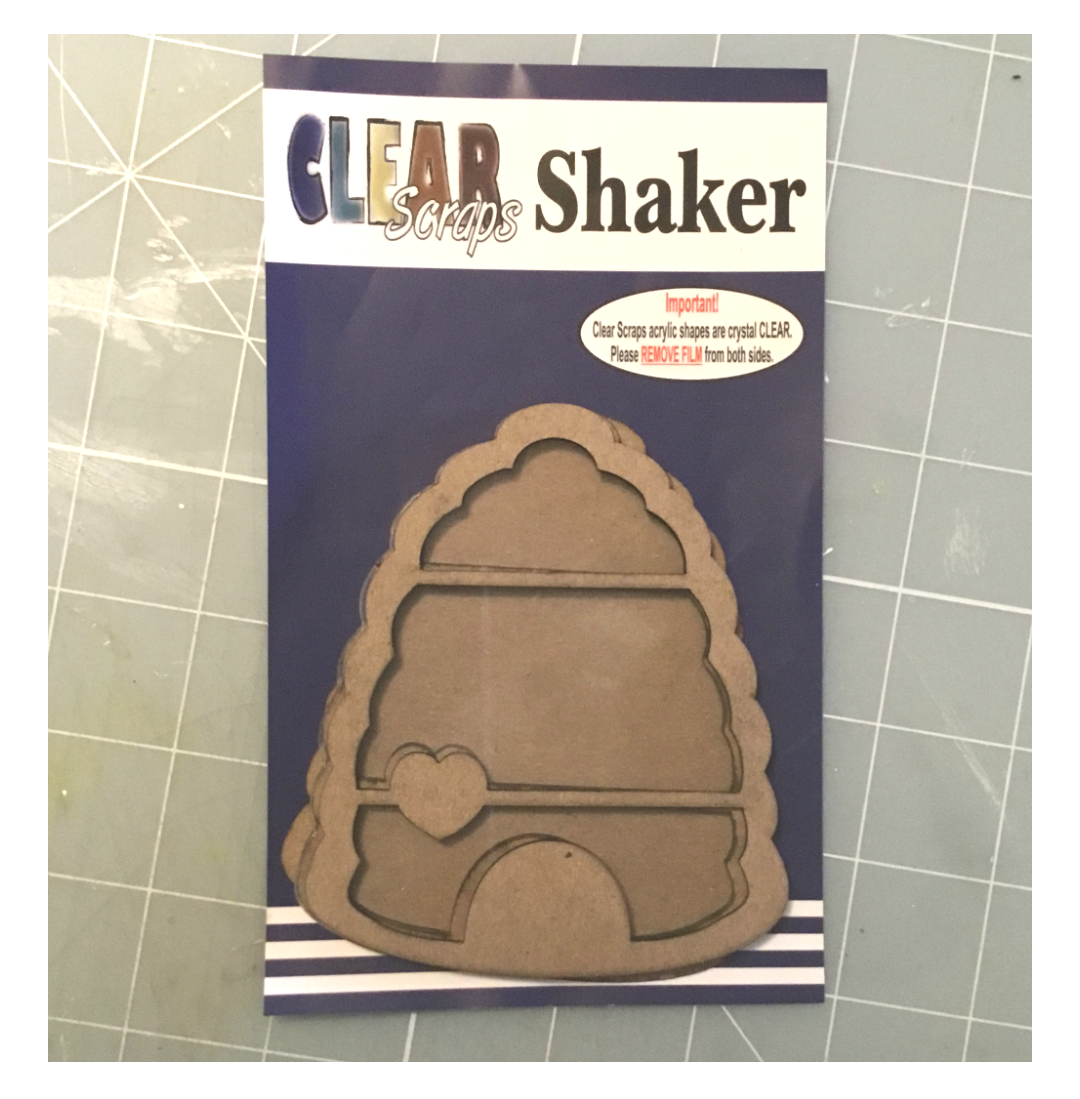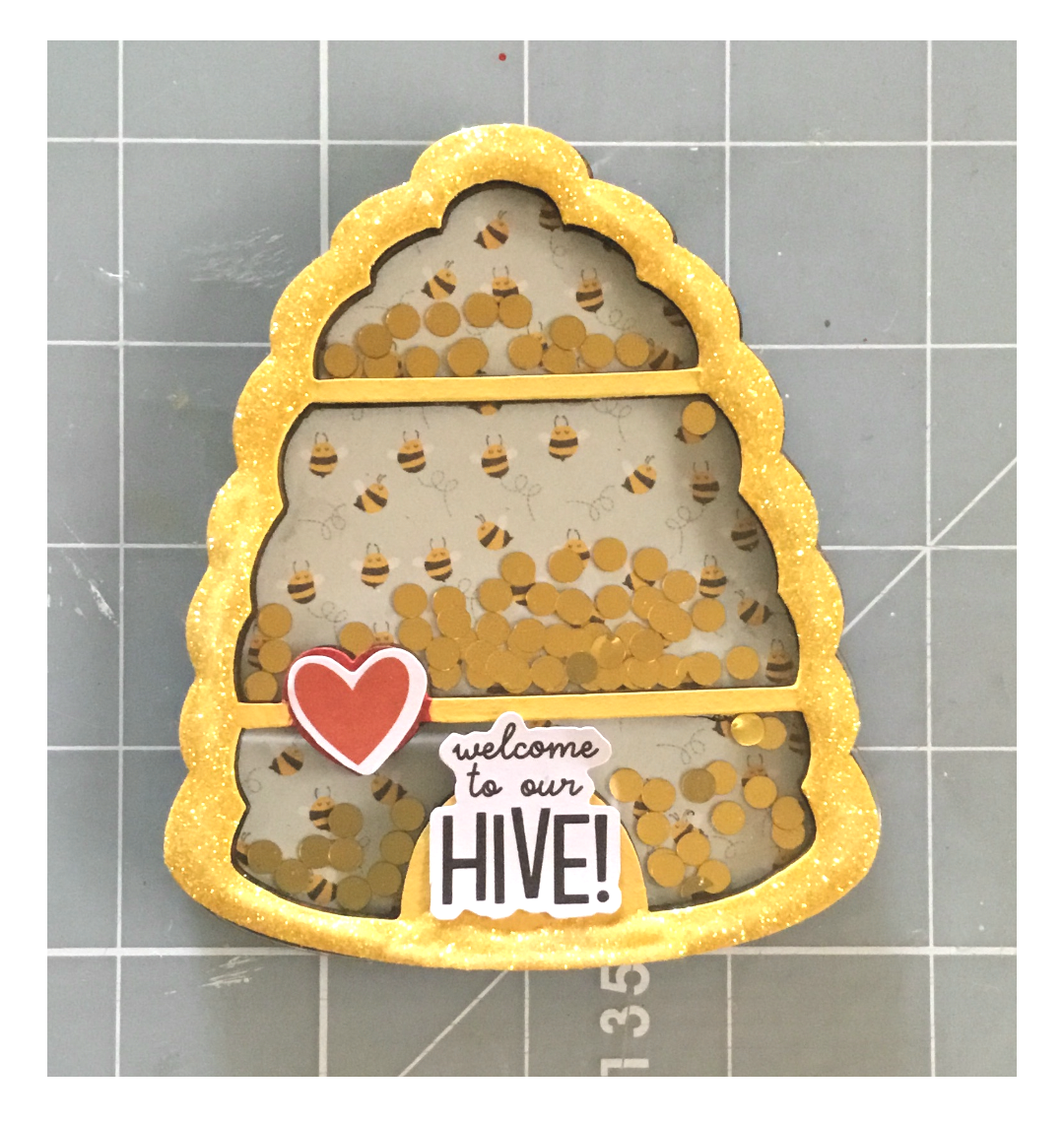 Now take your next 2 chipboard shakers pieces and glue on top of your bottom piece. Add any shaker filler you like to all 3 sections on your shaker. Peel off the protective film from both sides of your acrylic sheet and glue on top of the previous layers. Then glue the top shaker piece in place! I added a sticker sentiment to the bottom of my hive. Set your shaker aside to dry throughly before shaking!