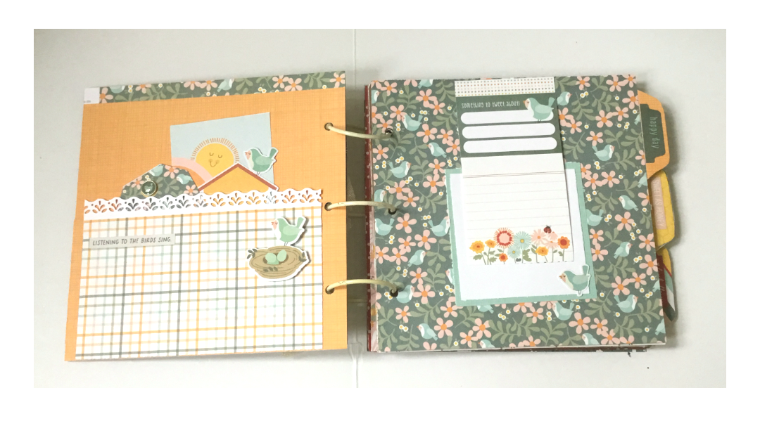 Page 2: using one of the journal elements card I scored 1/2 inch at the top and adhered as a flip up page. Underneath this, I added a photo mat measuring 4×4 from a scrap paper and a white cardstock 3 & 1/2 inches. Added a birdie sticker on the bottom corner of my photo mat. The tab I covered with a scrap paper and sticker sentiment.