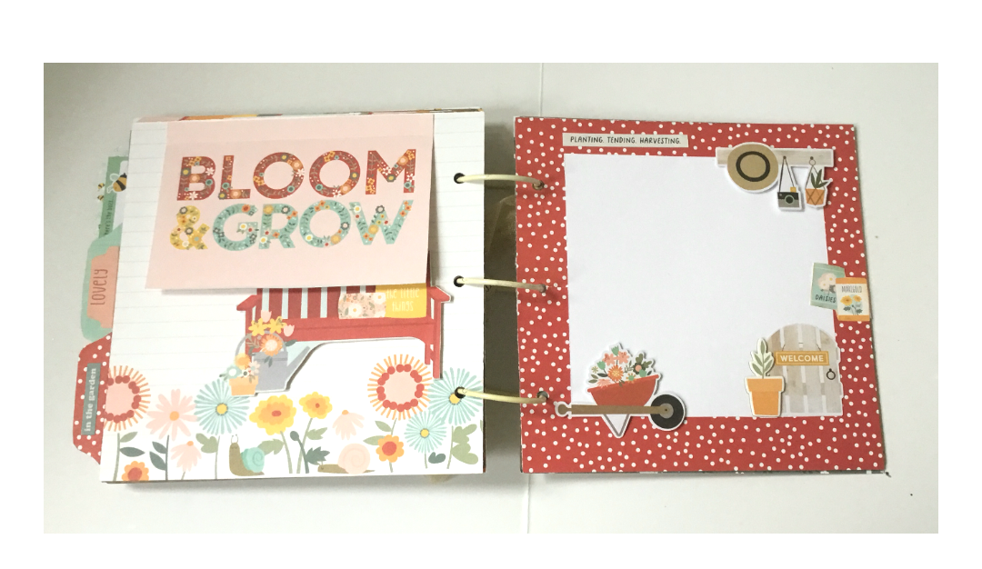 Page 7: Bloom and Grow journaling card adhered at the top as a flip up page. Score 1/2 inch at the top before adhering. Fussy cut out the bench image from one of the journaling cards and adhered underneath using foam dots.