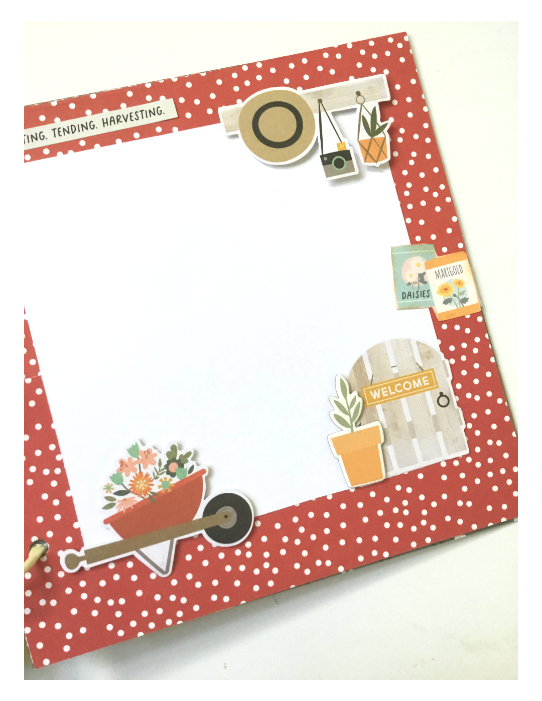 Page 8: white cardstock photo mat measures 6×6 inches. Added a variety of ephermera pieces, using foam dots. Potted plant is a chipboard sticker and sentiment sticker at the top.