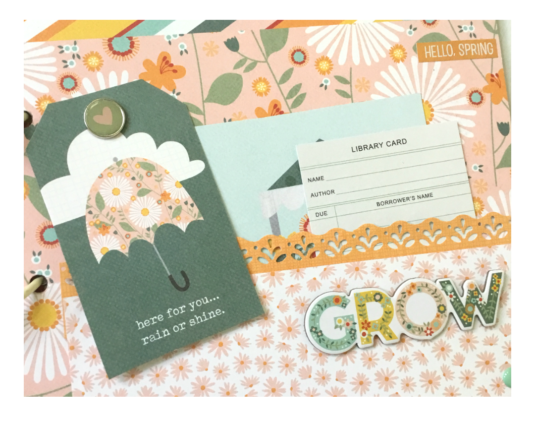 Page 6: another pocket page and border punch. Tucked a tag and journaling cards inside pocket. Grow foam sticker adhered to the pocket and 3 enamel dots!
