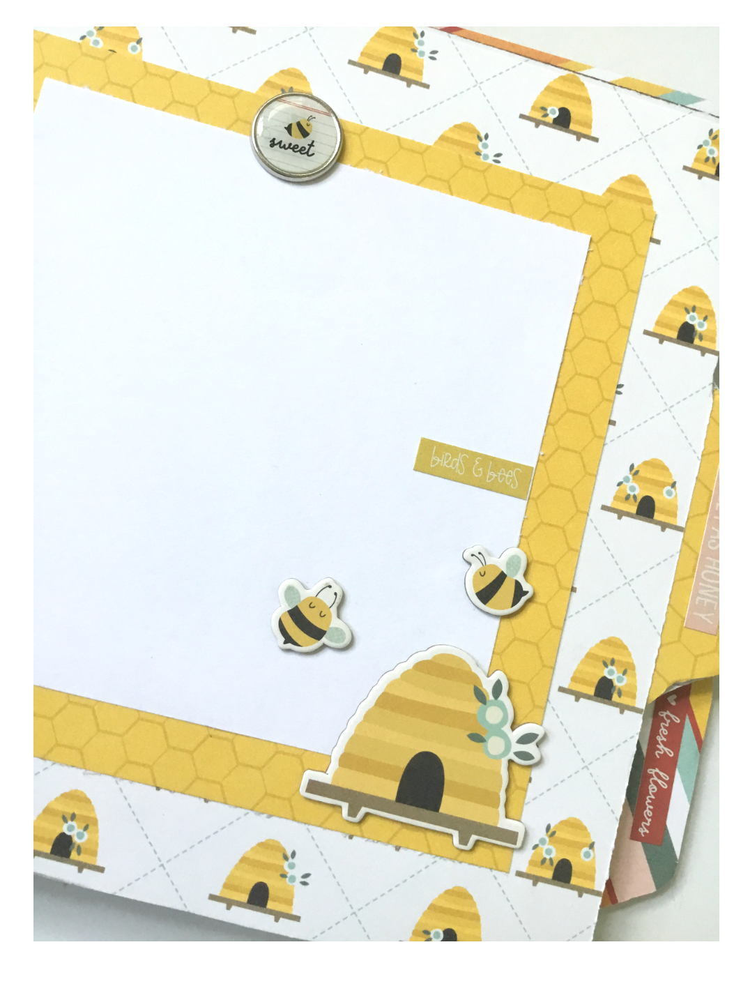 Page 3: using a 6×8 paper, I scored 1/2 at the top and adhered as a flip up page. Adhered a foam sticker bee on my flip page. Underneath I adhered a scrap strip aling the middle seam on my page.