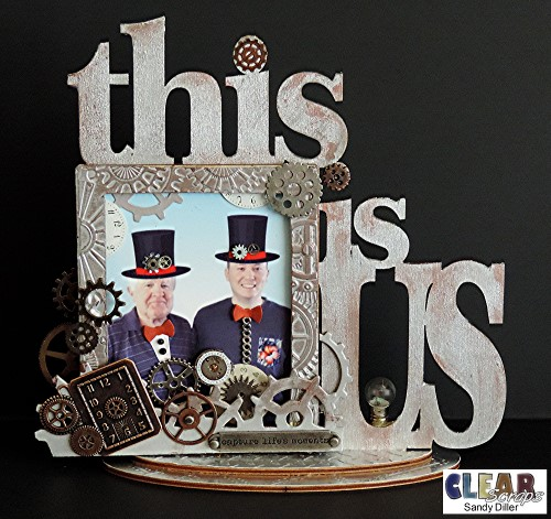 It's Sandy Diller here today with a fun little project that I created using the fabulous This Is US Desktop Frame. I love Steampunk and all the images, gears, cogs and top hats that go with it. I had some fun with photo editing and got out some of my favorite things from my stash. Our grandson recently visited so I used a photo of him and grandpa in a playful way.